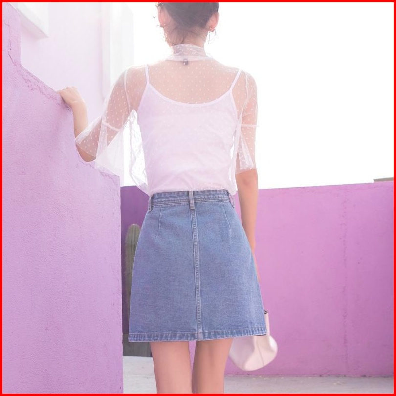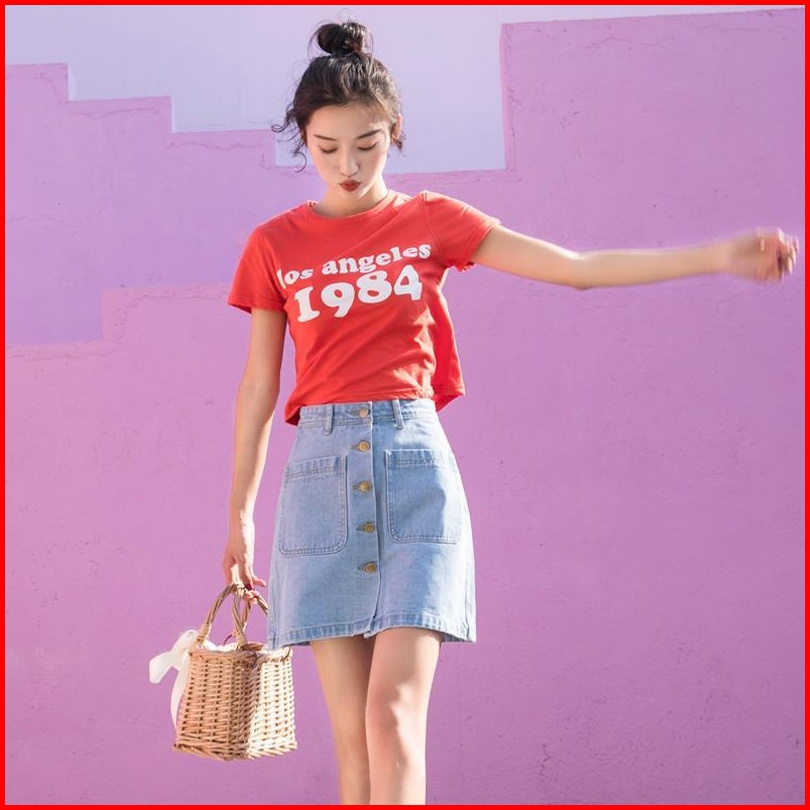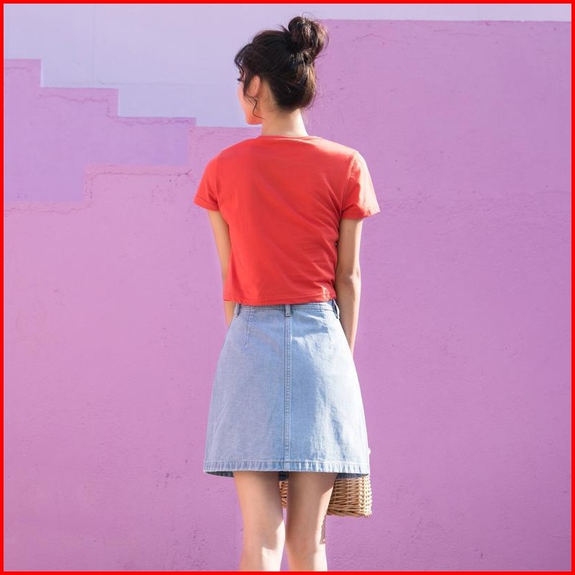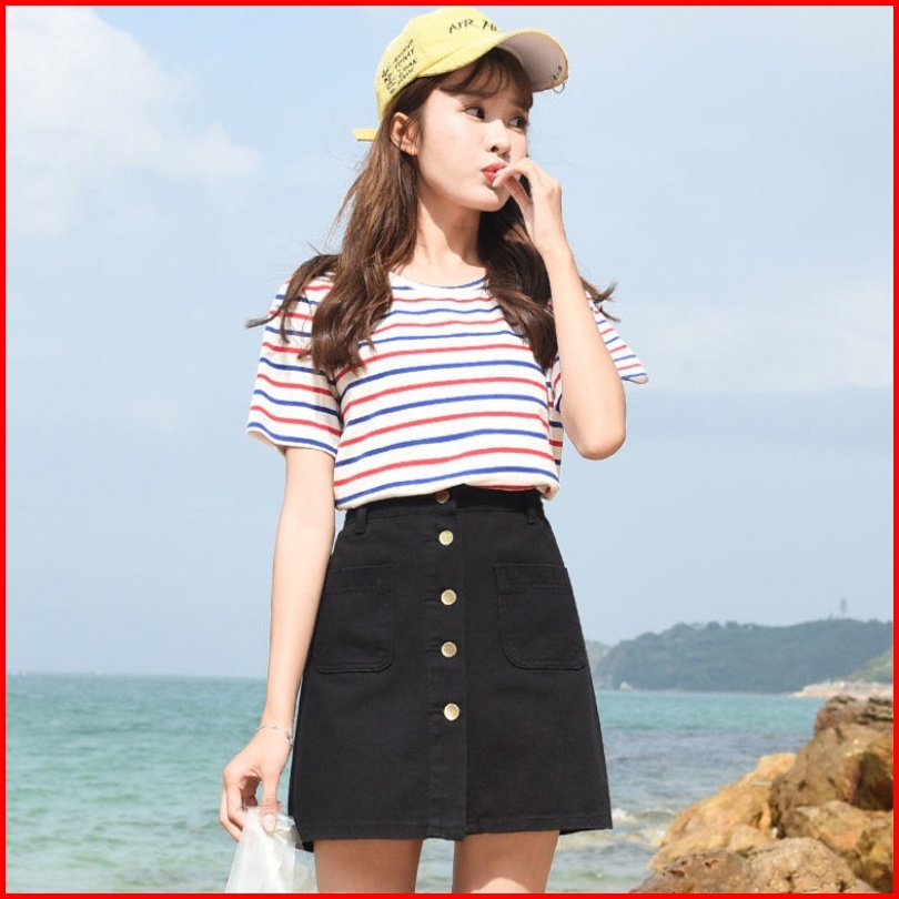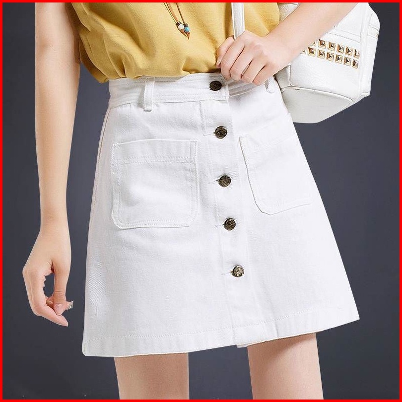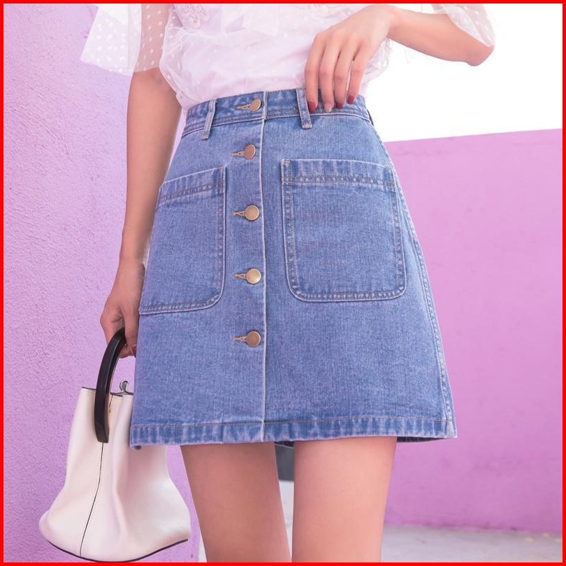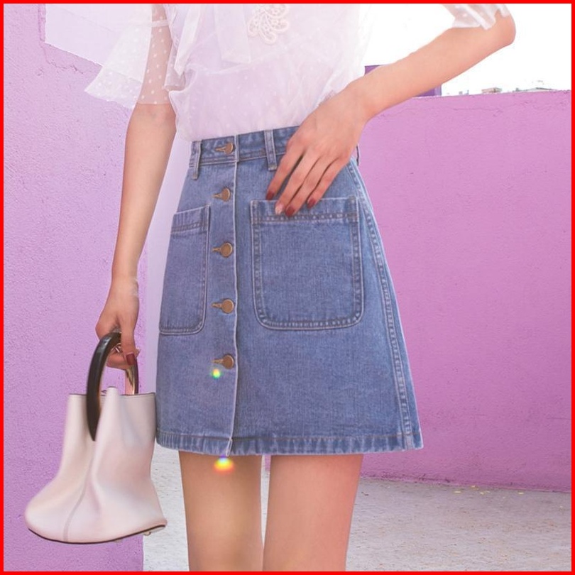 Rok Denim Korean Style Pinggang Tinggi A-line Skirt Denim Rok Wanita Jeans Rok Berkancing Rok Berkantong