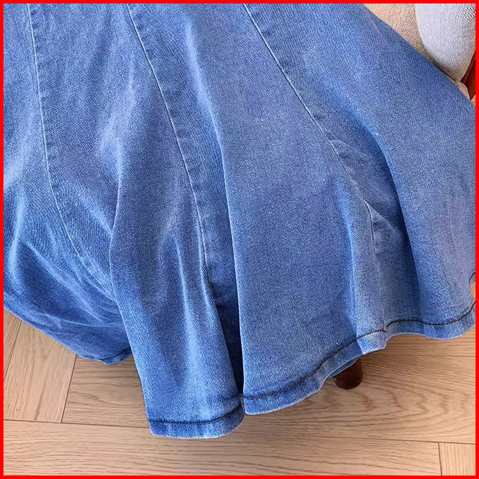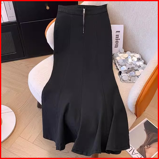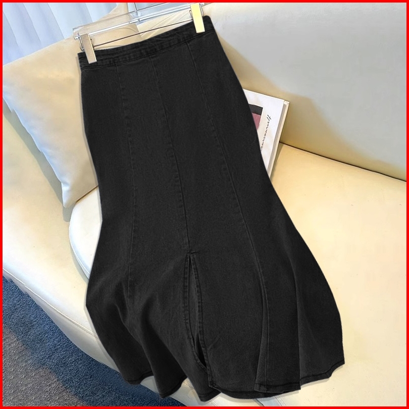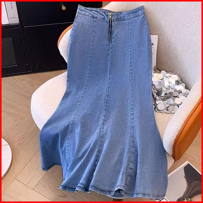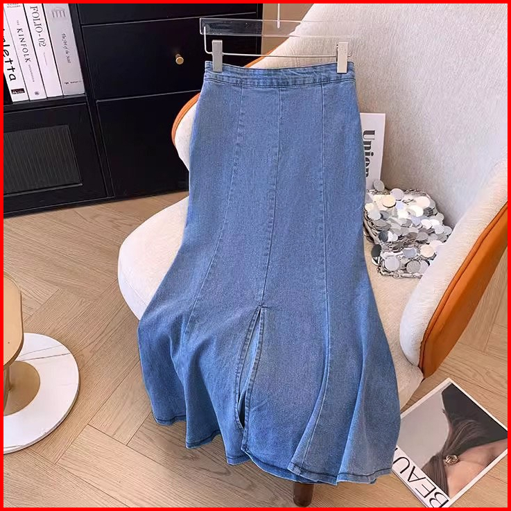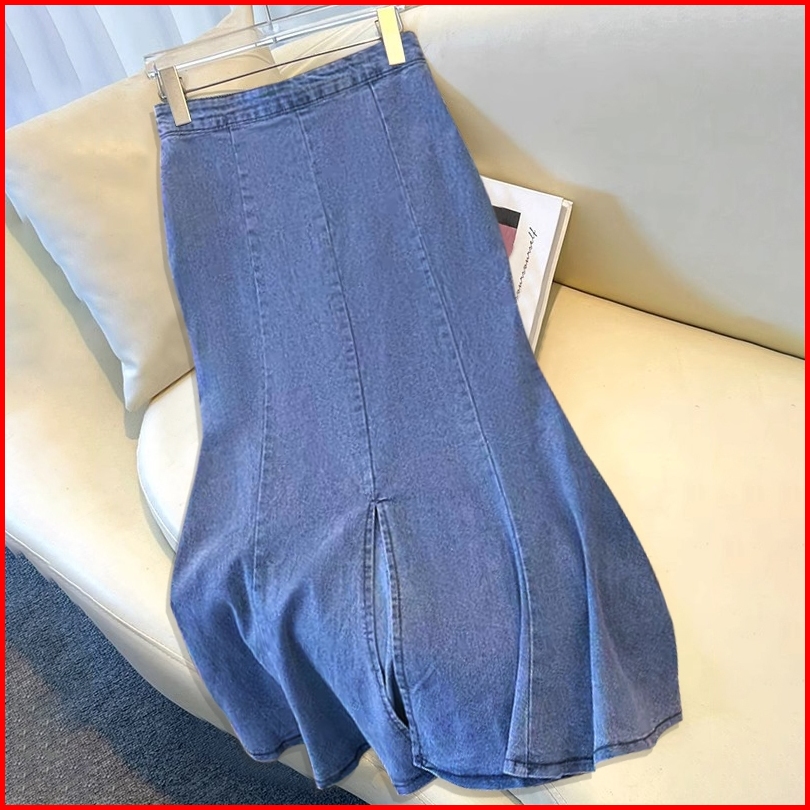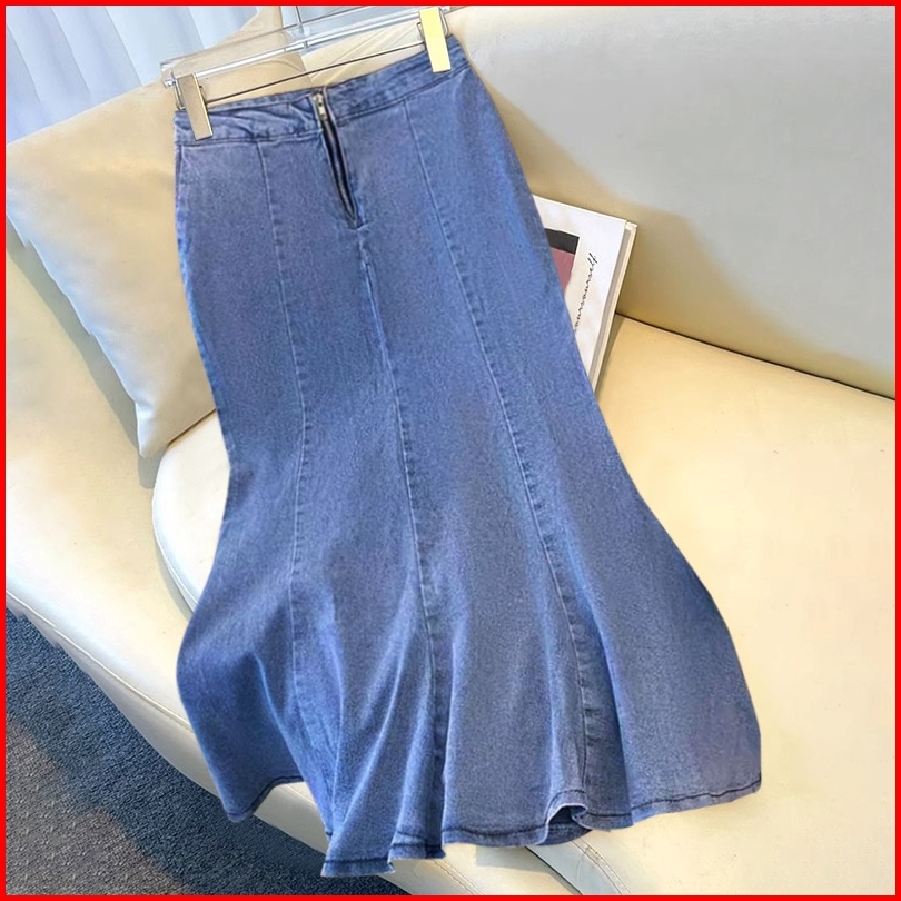 Kekinian Factory Denim Half Length Skirt Wanita High Waisted Mid Length Zipper Wrap Buttocks Fishtail Skirt Rok Jeans Me