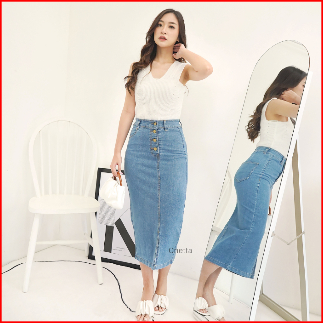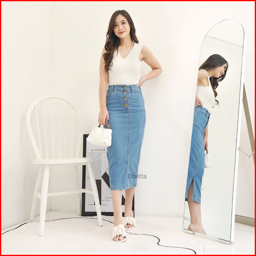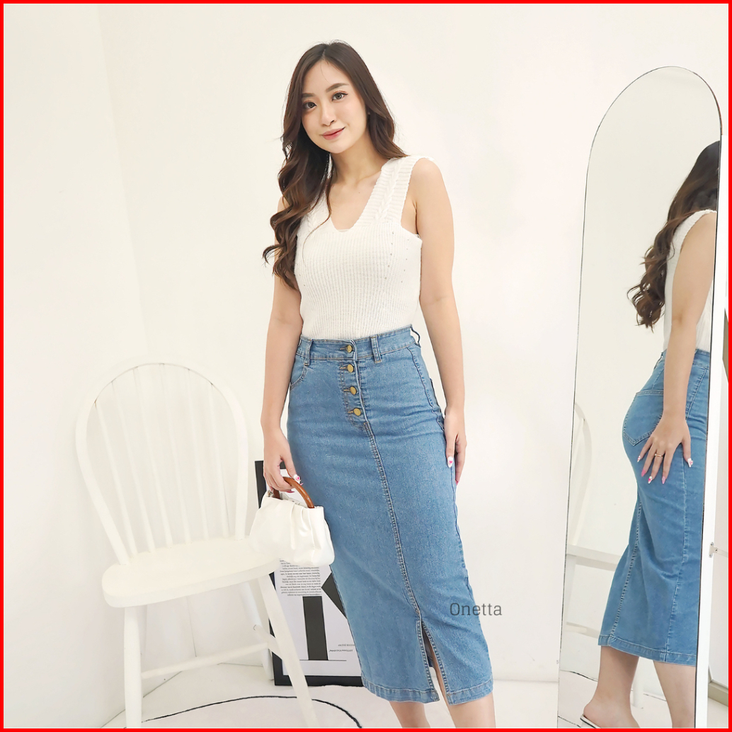 Onetta - Rok Span Jeans Belah Depan Midi Skirt Larissa Aqua