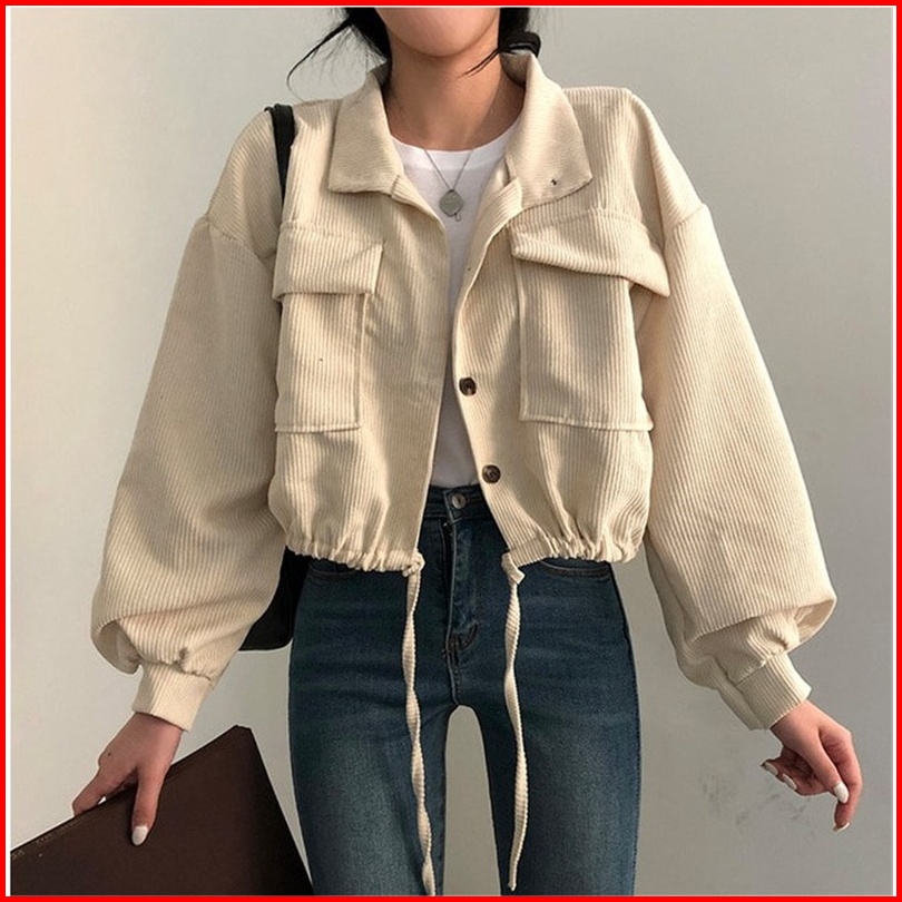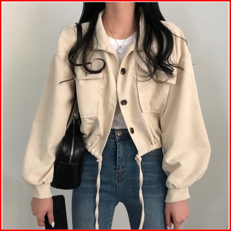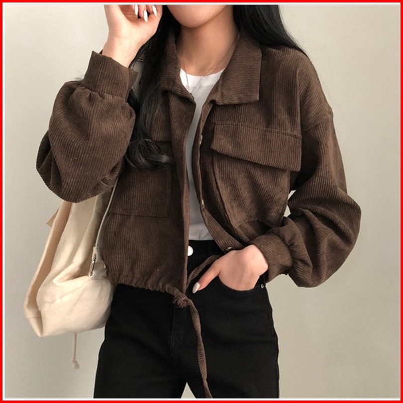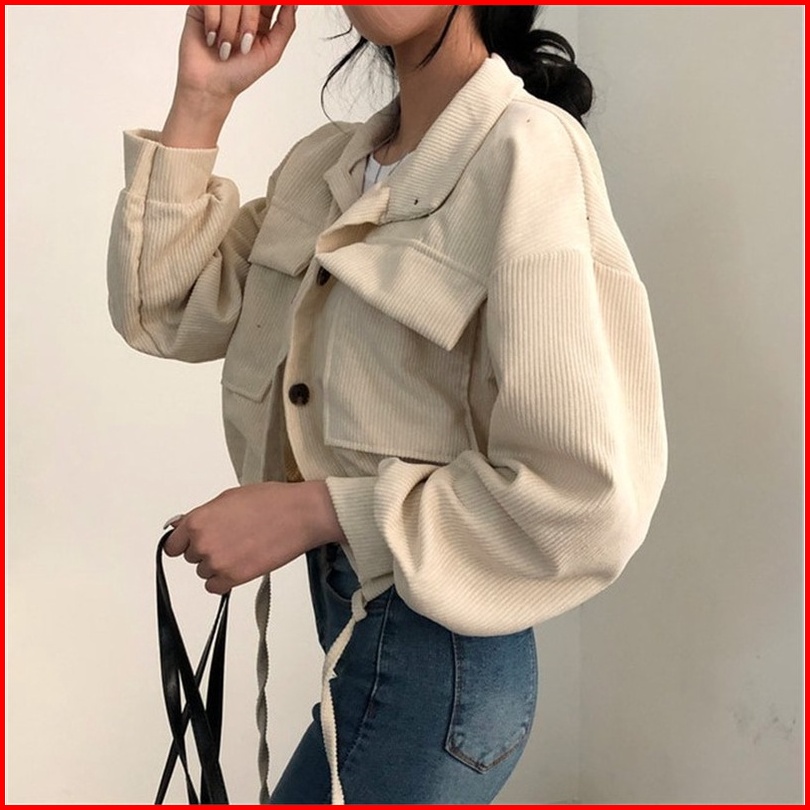 Xiaozhainv Jaket Corduroy Wanita Korean Style Lengan Panjang Crop Top