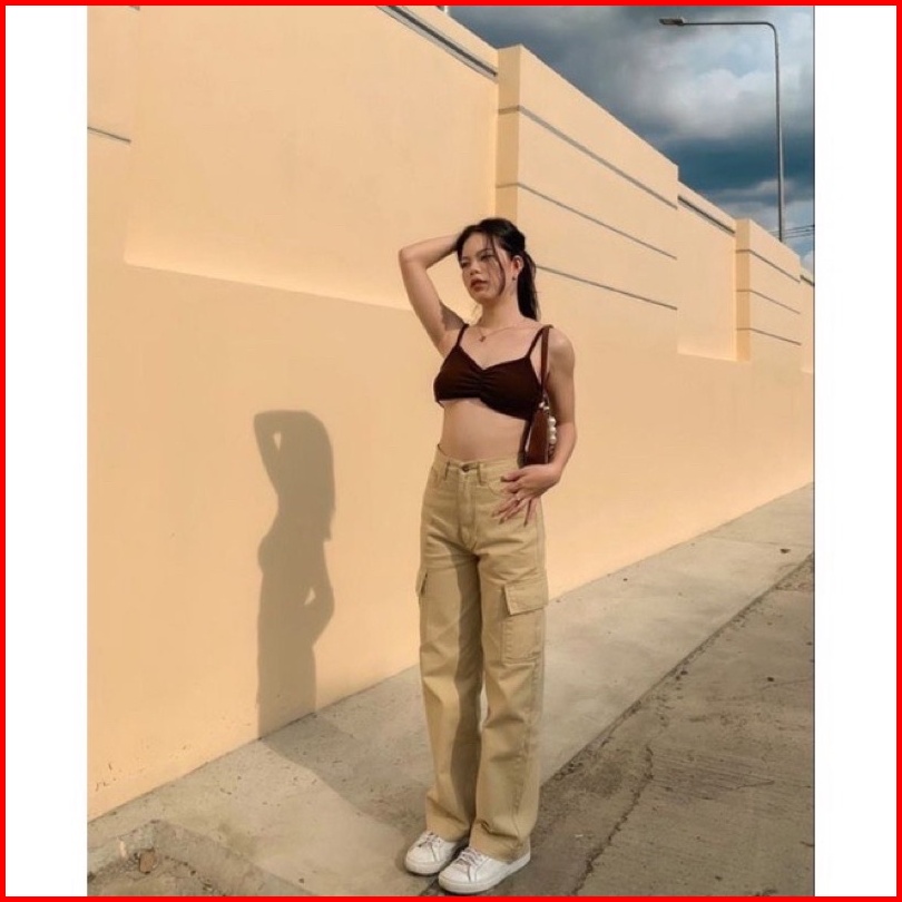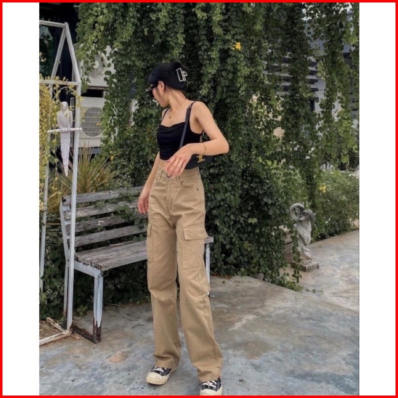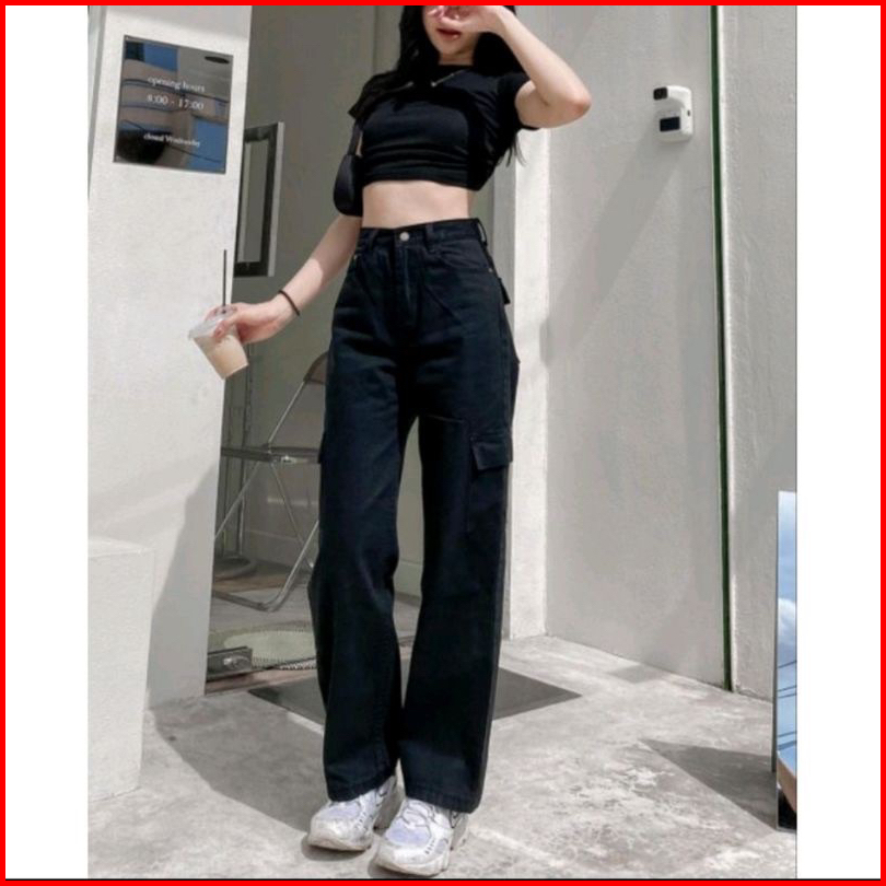 Thegirlhouse - Celana Cargo Highwaist Loose Jeans Wanita Warna Kulot Cargo Higwaist Helena