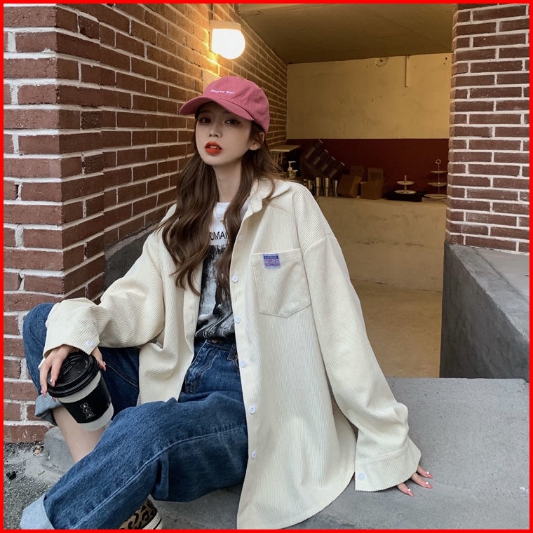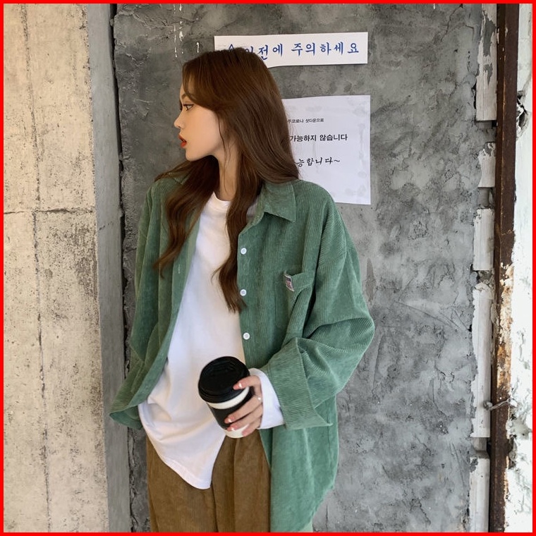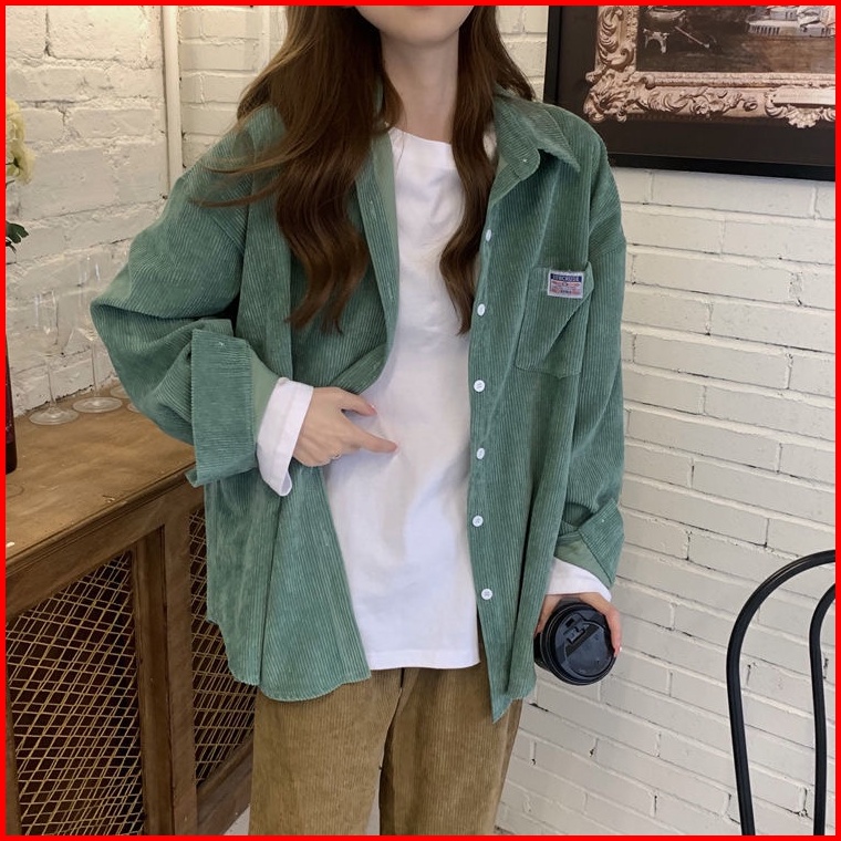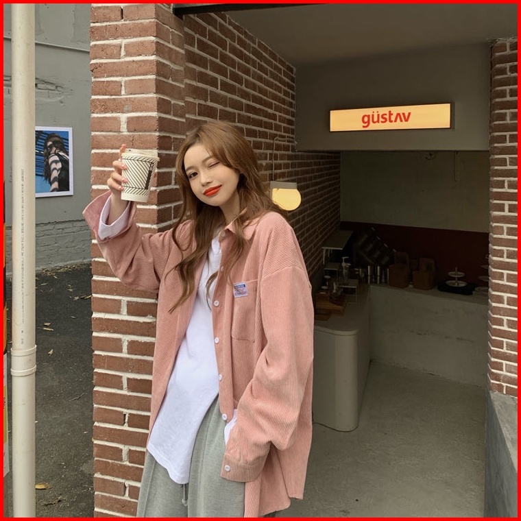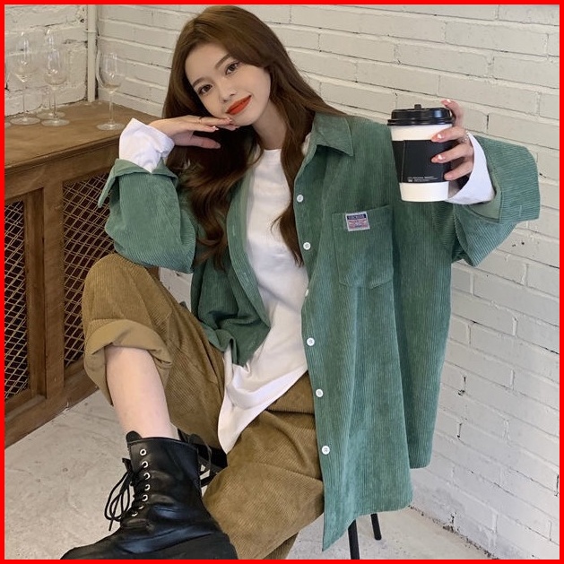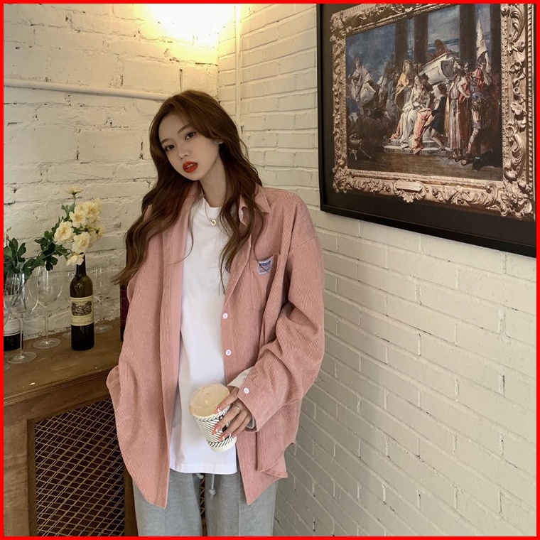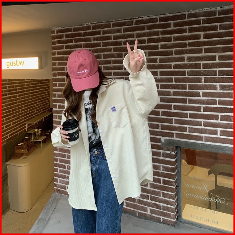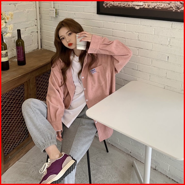 Kemeja Korduroi Gaya Korea Atasan Lengan Panjang Wanita Longgar