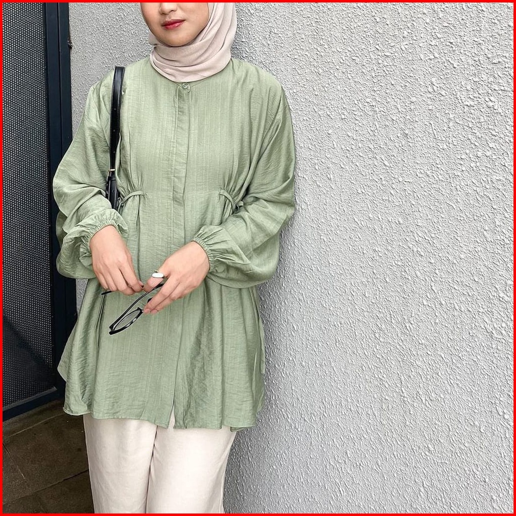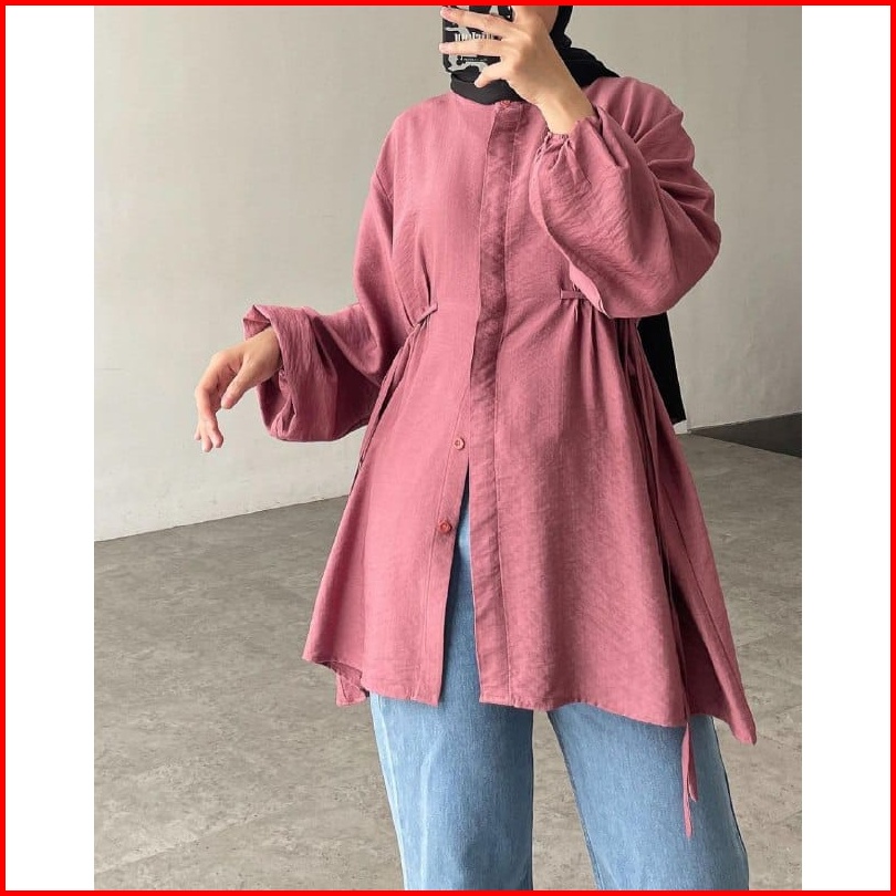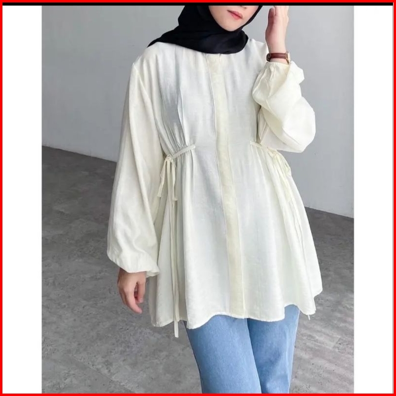 Amanda Blouse Semi Tunik Pollo Linen Premium Blouse Wanita Tali Pinggang Kemeja Kerja Formal