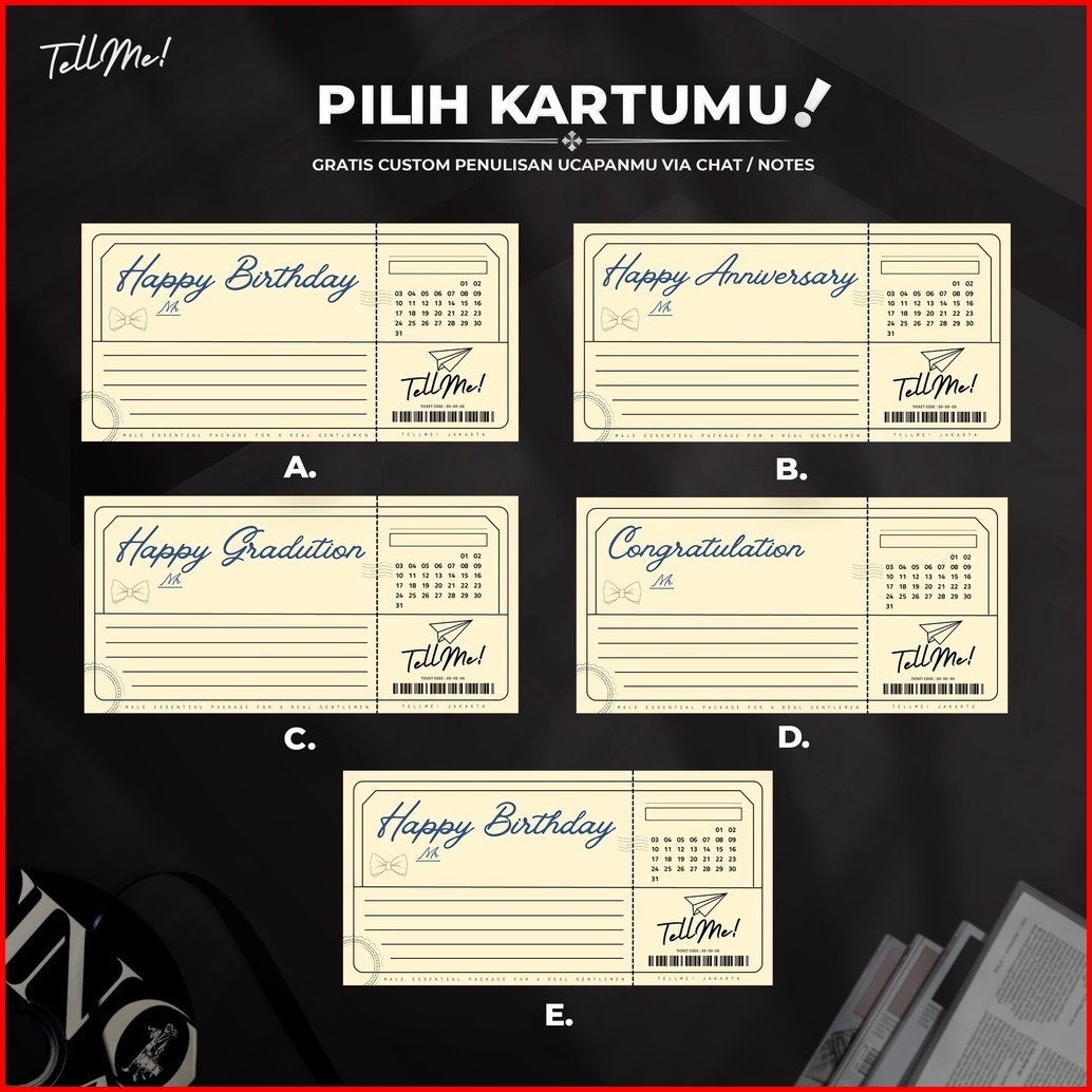 A. Happy Birthday, B. Happy Anniversary, C. Happy Graduation, D. Congratulations, E. Kartu Polos