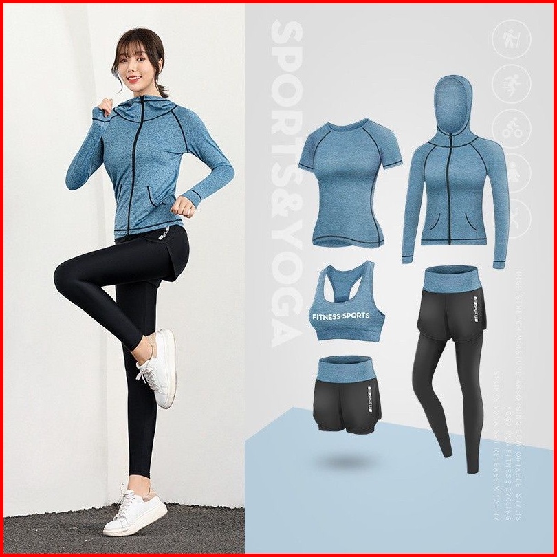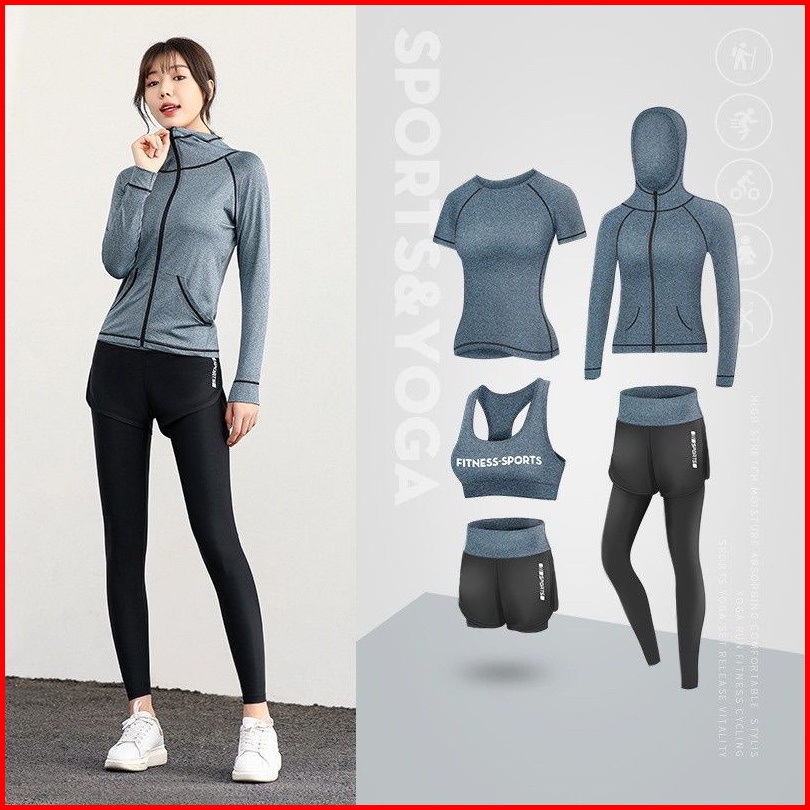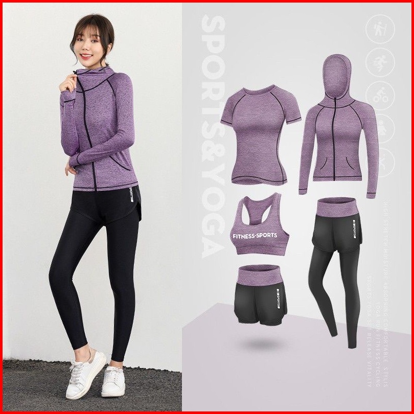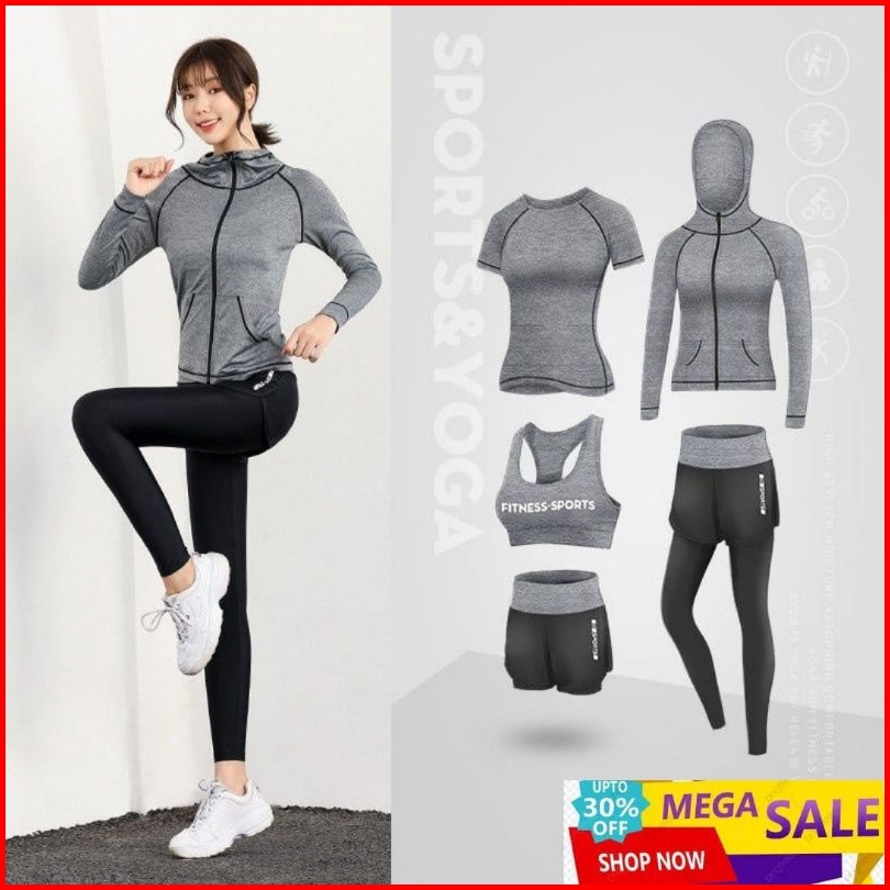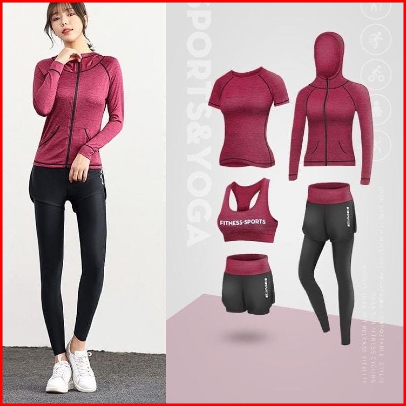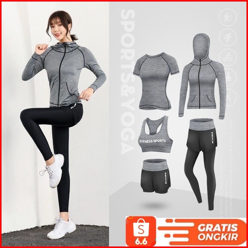 Setelan Olahraga Wanita 5pcs Baju Sportbra Celana Pendek Legging Jaket Gym Running Yoga Sepedaan