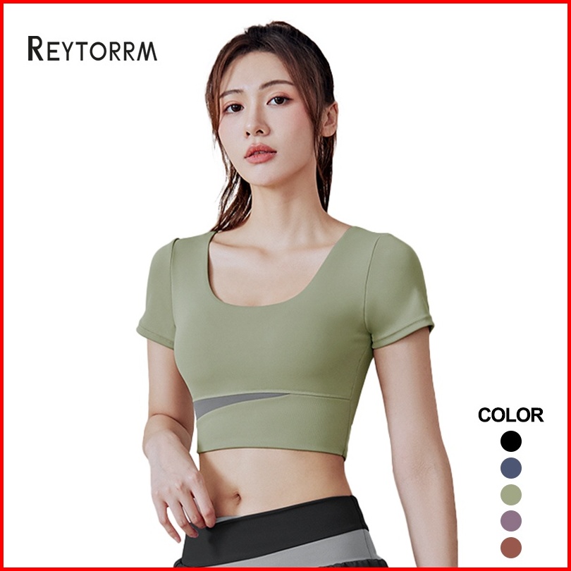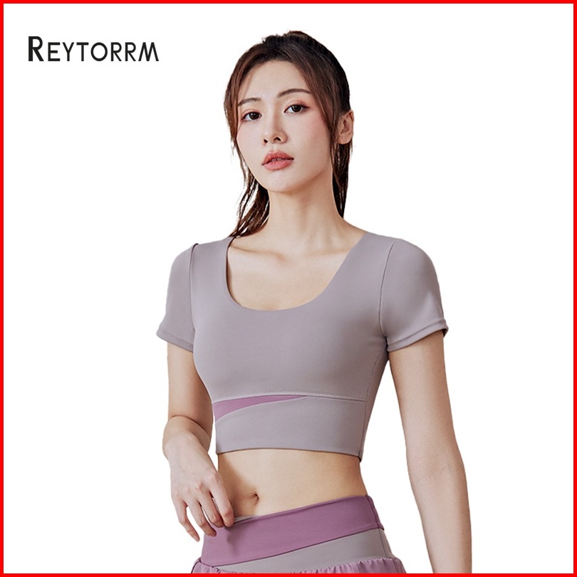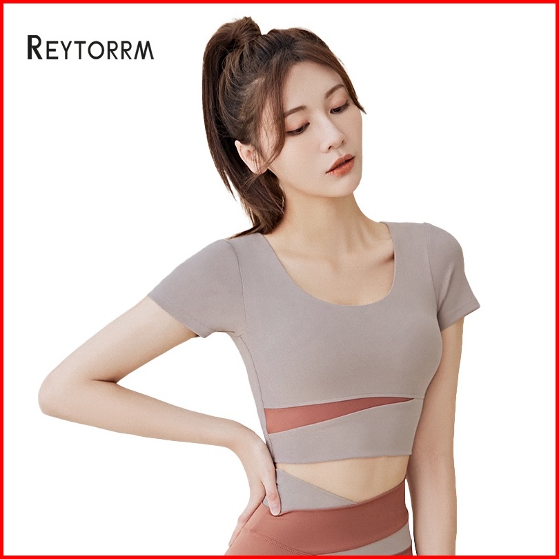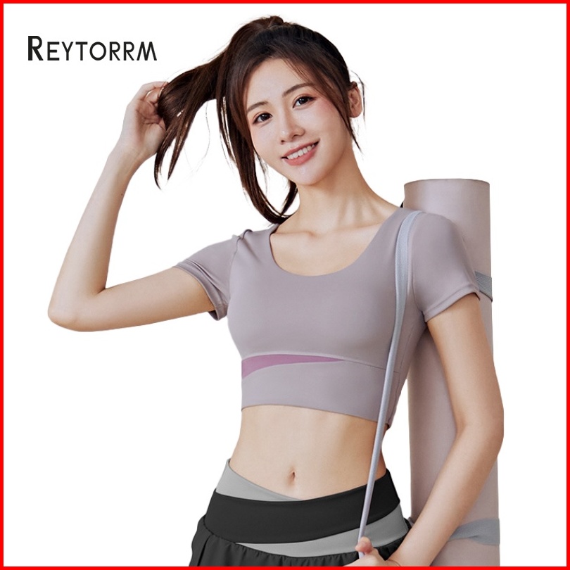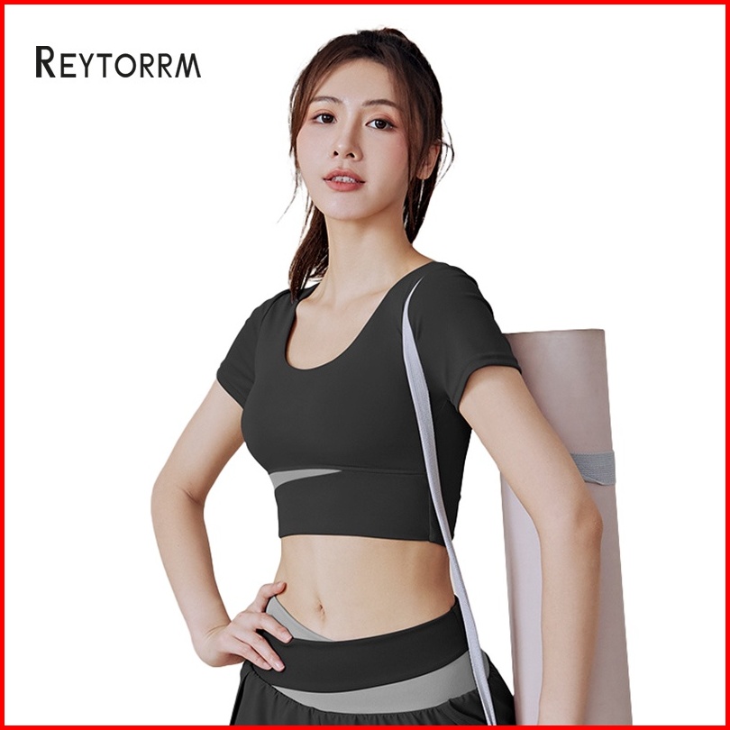 Reytorrm Pakaian Yoga Wanita Olahraga Yoga Lengan Pendek Pakaian Kebugaran Cepat Kering Dengan Bantalan Dada Jymd013