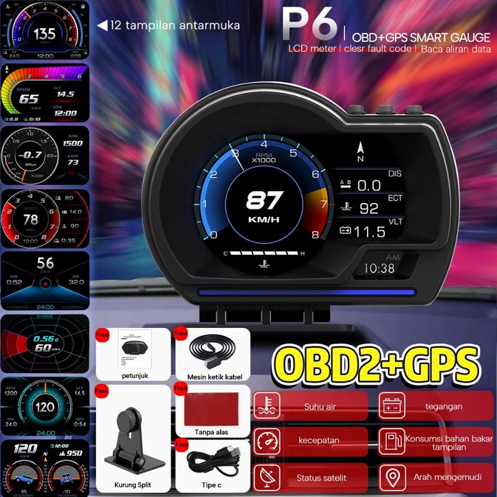 CAR SMART GAUGE P6 OBD2+GPS HUD SMART CAR LAYAR DISPLAY HD SISTEM KODE KESALAHAN BISA DIHAPUS
