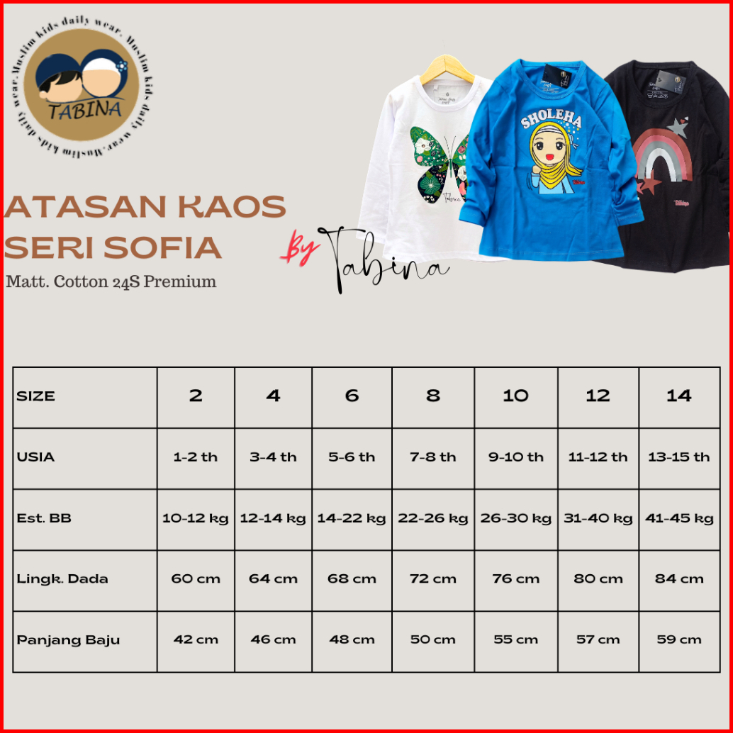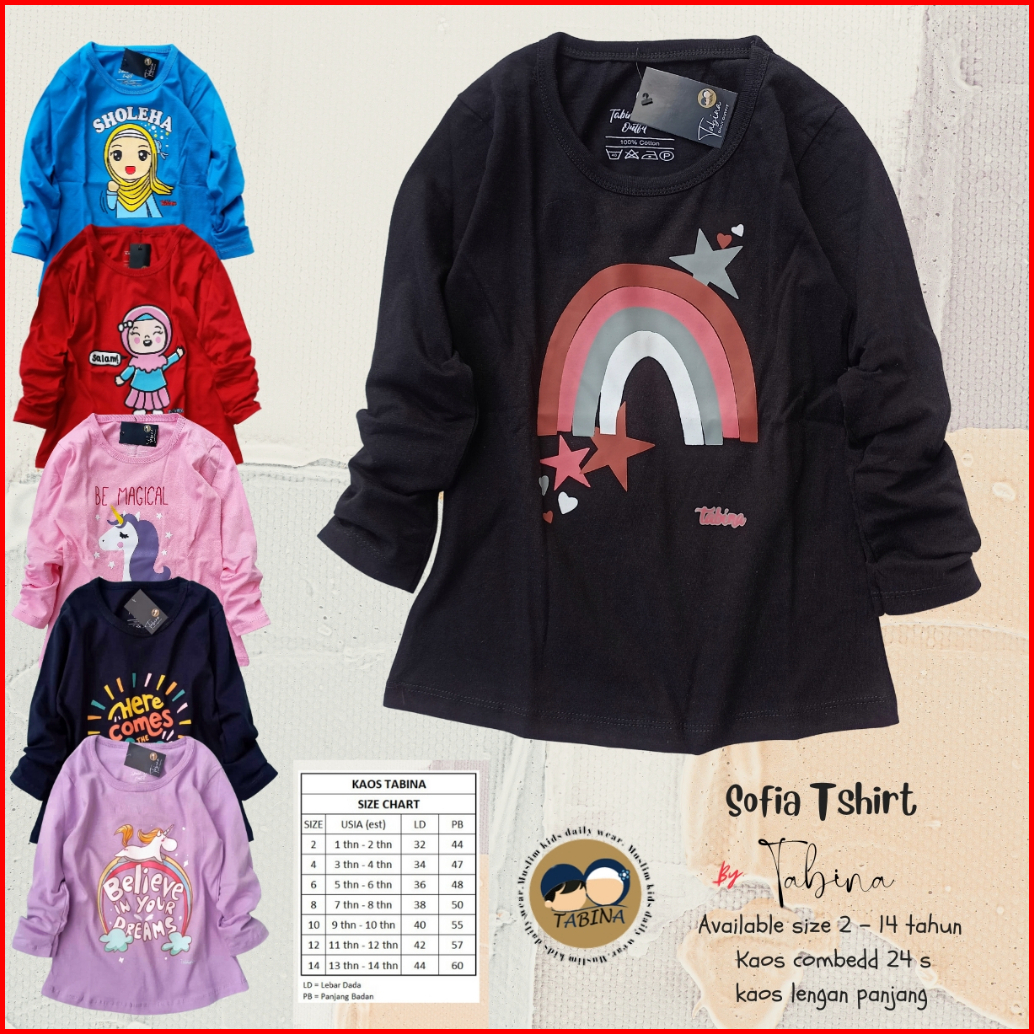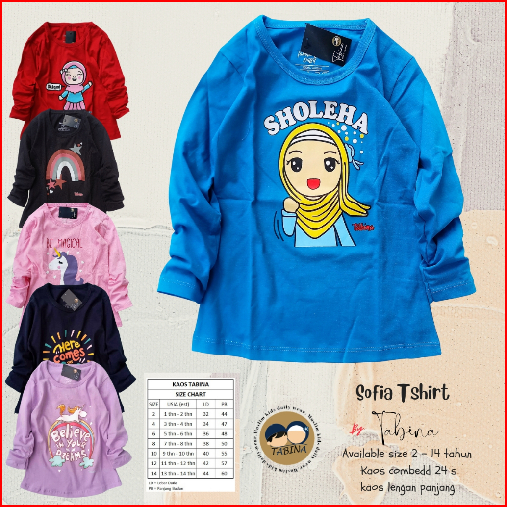 Tabina Kaos Anak Perempuan Lengan Panjang Seri Sofia Usia 2 Tahun Hingga 14 Tahun Max Bb 45 Kg
