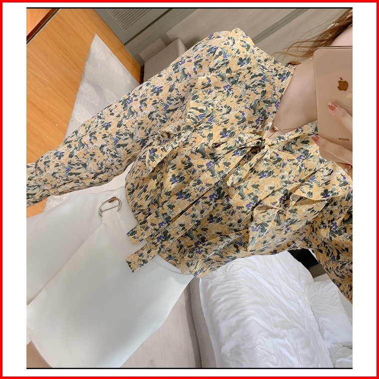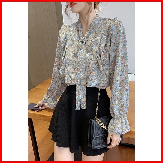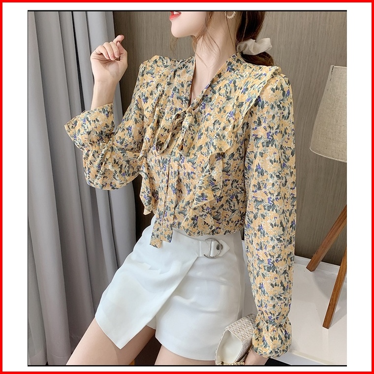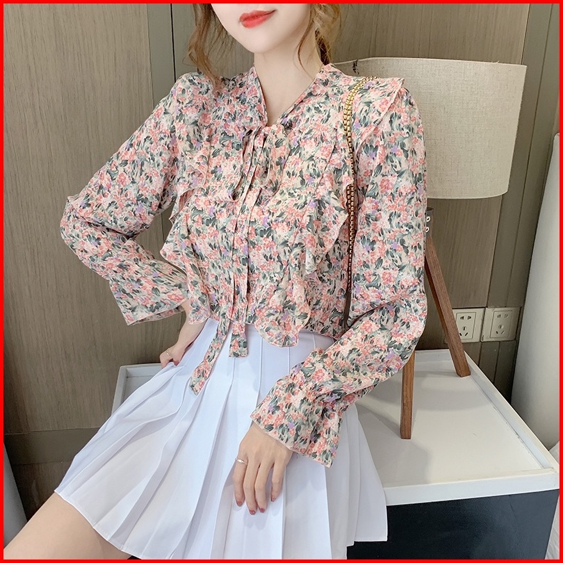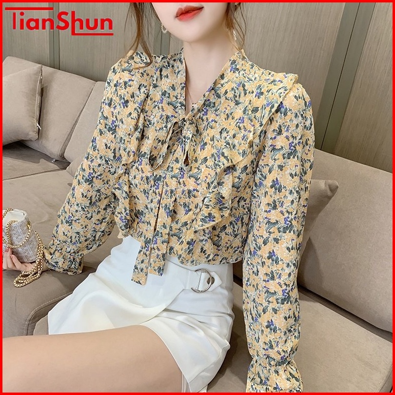 Tianshun Lengan Panjang Blus Wanita Musim Panas Casual Fashion Korea Style Blouse Motif Bunga Bahan Sifon Warna Pink Ata