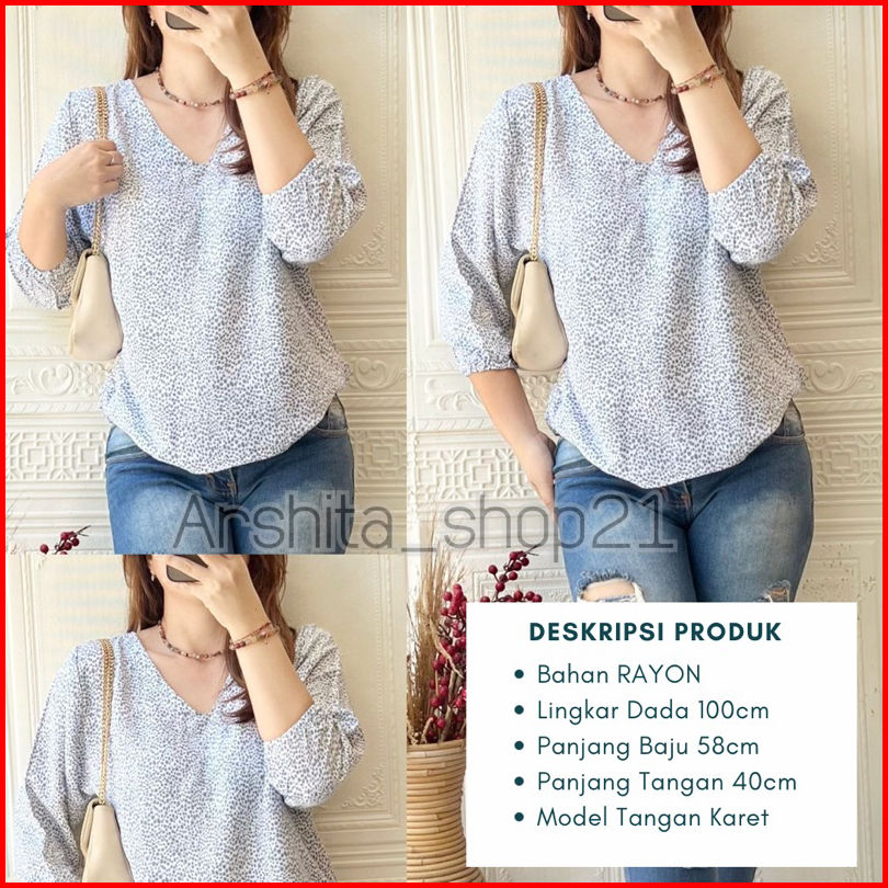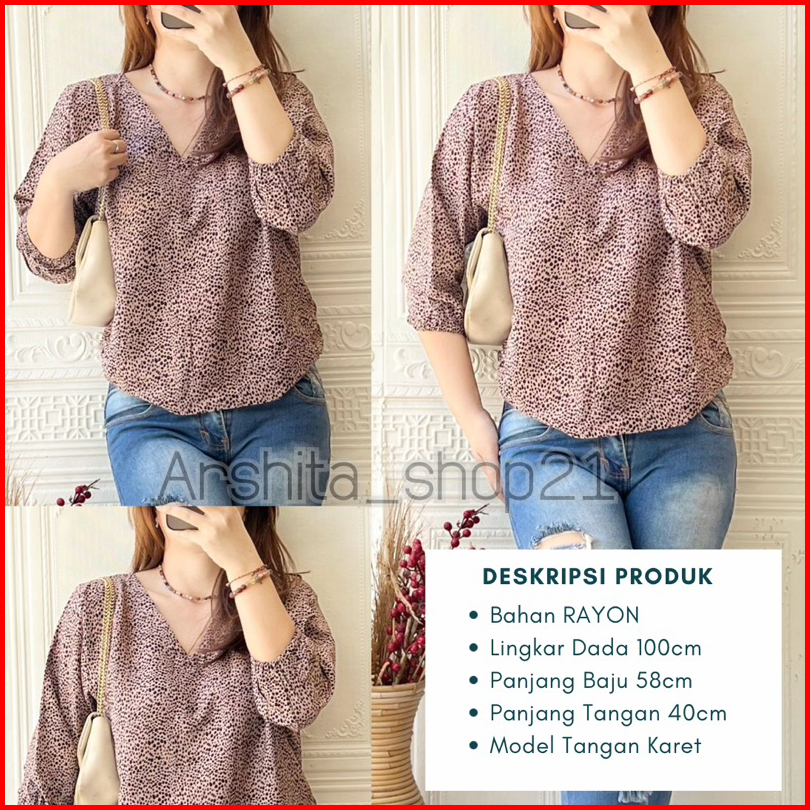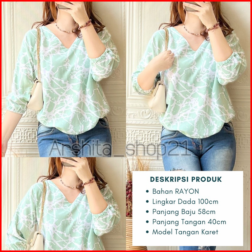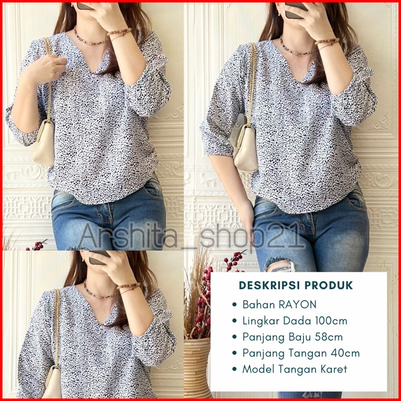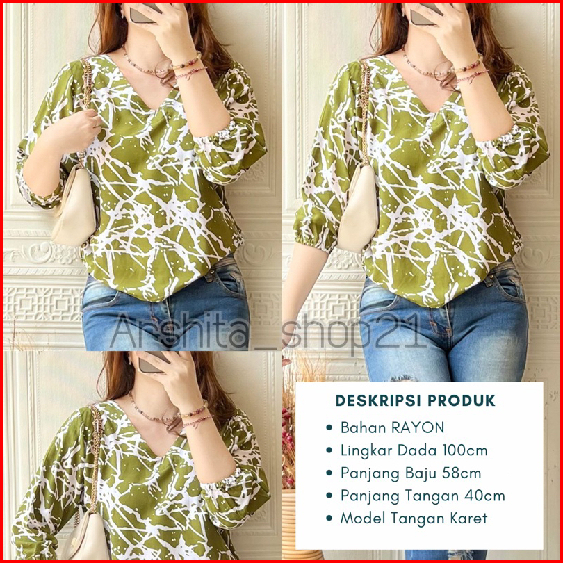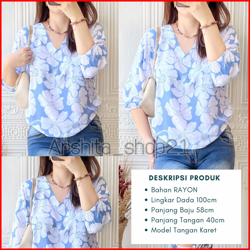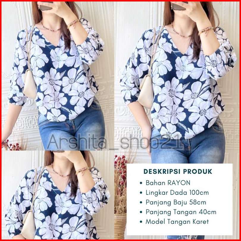 Hana Blouse B01101 Atasan Wanita Terlaris Bahan Rayon Premium Blouse Kekinian Leher V Simple Elegan Tangan 7 8 Karet Mot