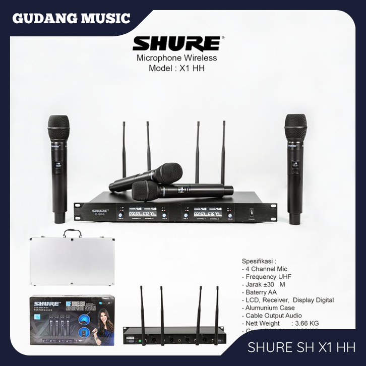 Mic Wireless Shure Sh X1 HH Handle Microphone Wireless Karaoke 4 Mic Pegang Handheld Koper Hardcase