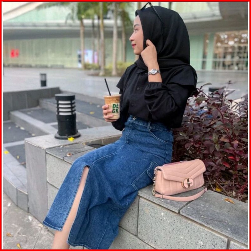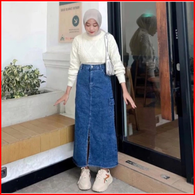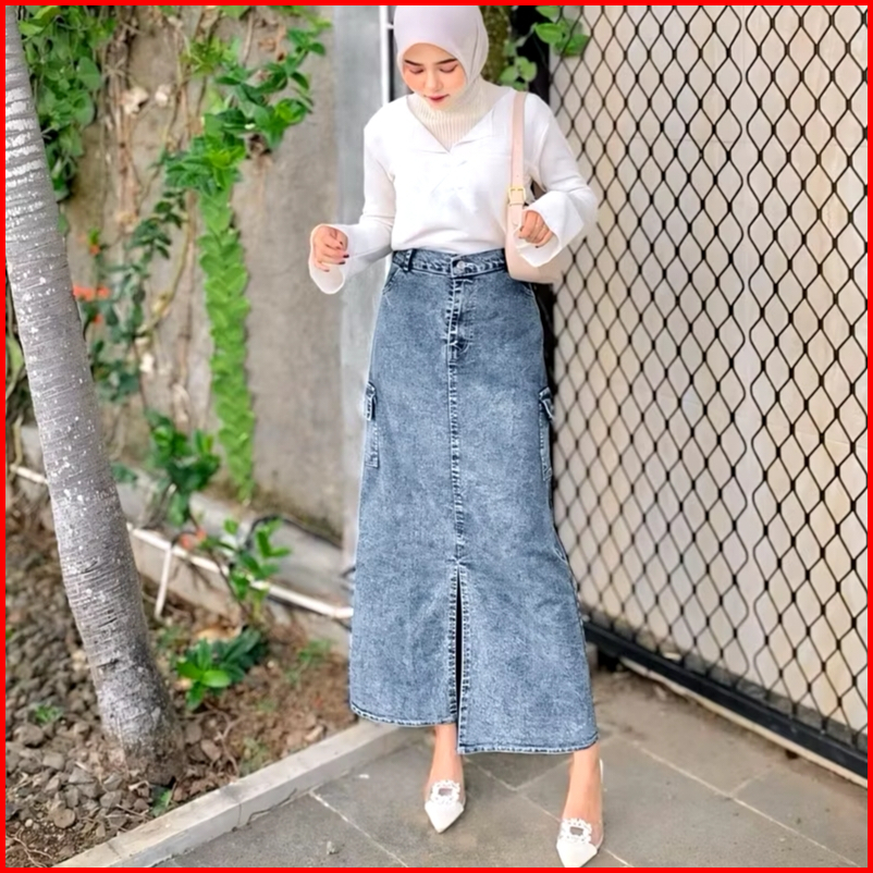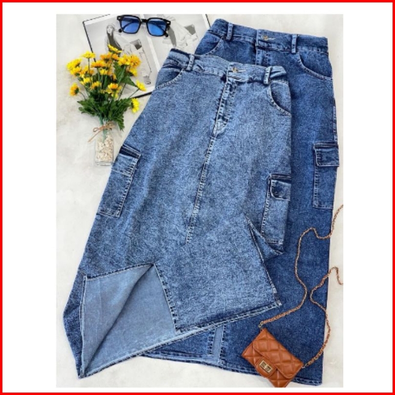 Rok Jeans Cargo Wanita Panjang Skirt Korean Style Belah Depan Saku Samping - Azimah