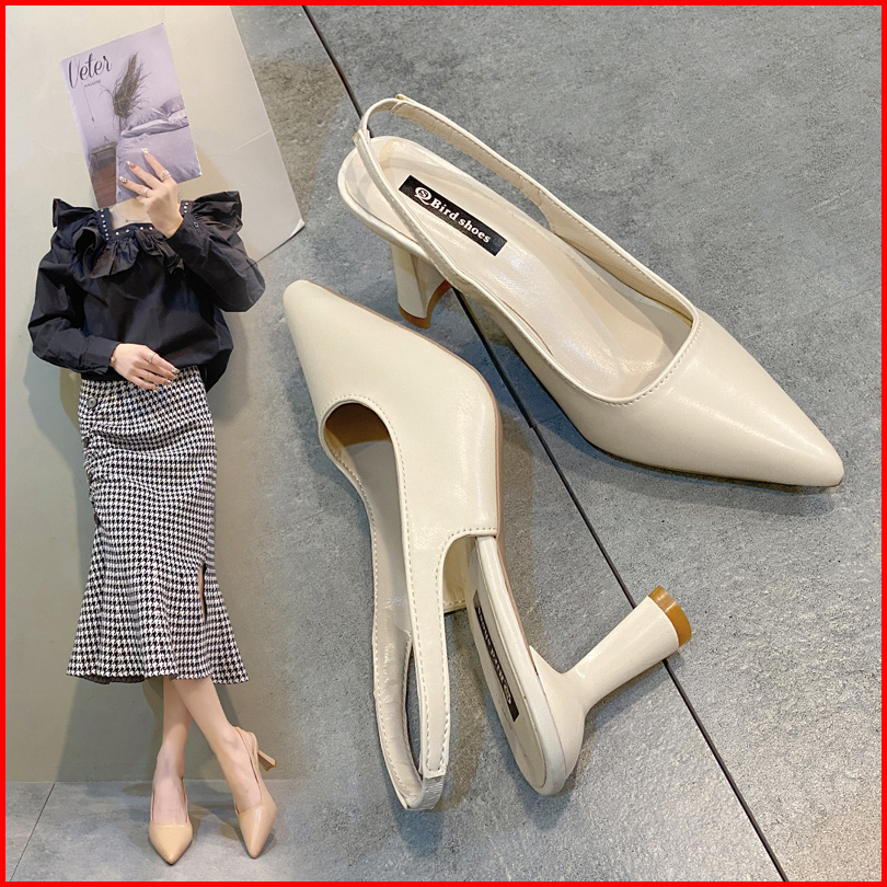 Sepatu Hak Tinggi High Slingback Heels Kerja Kantor Putih Wanita Hitam 7.5cm Kekinian Import Strap Tali Belakang Murah T