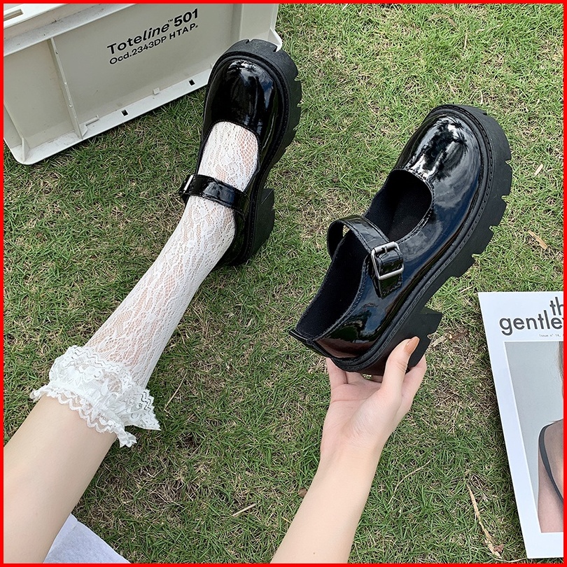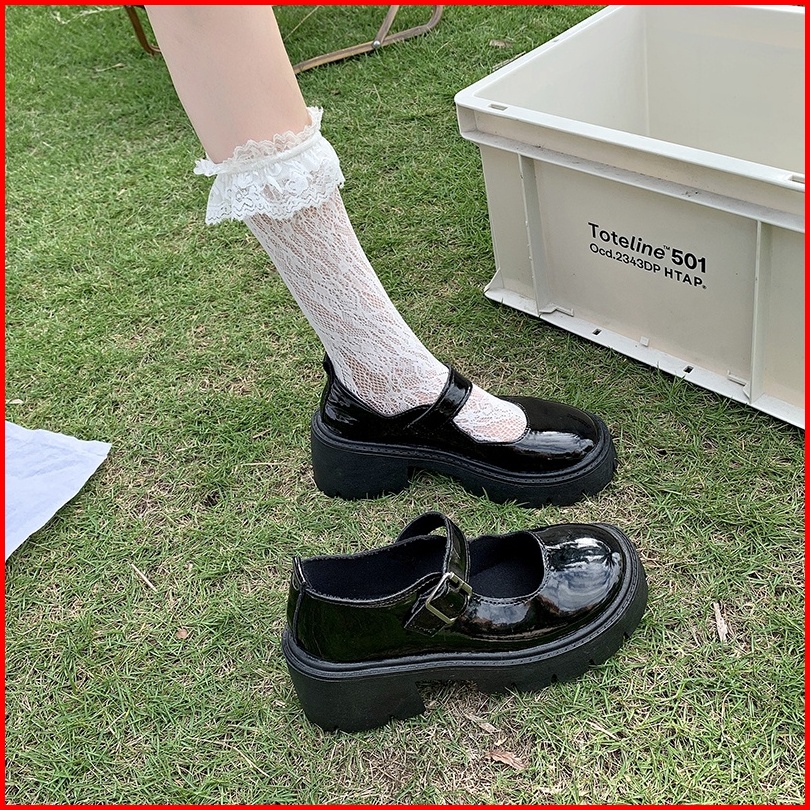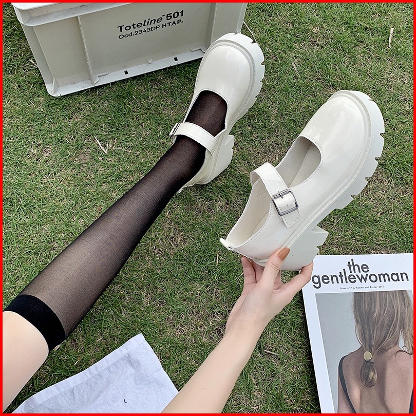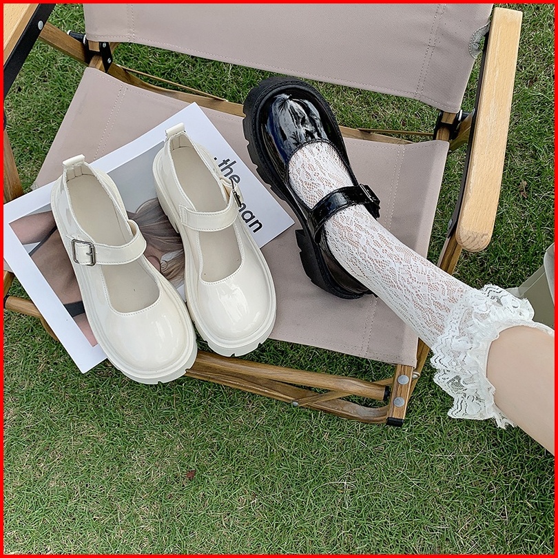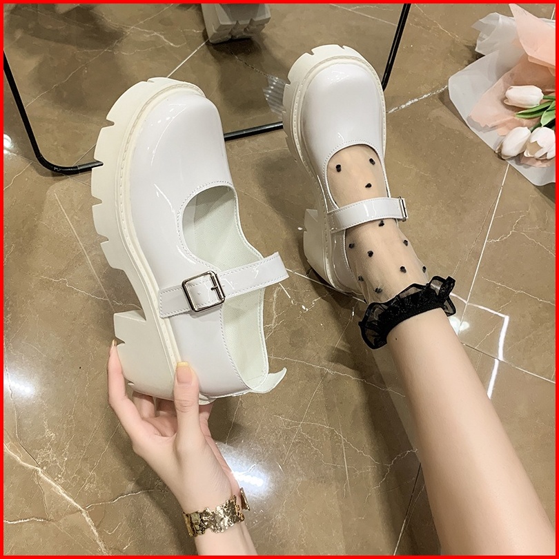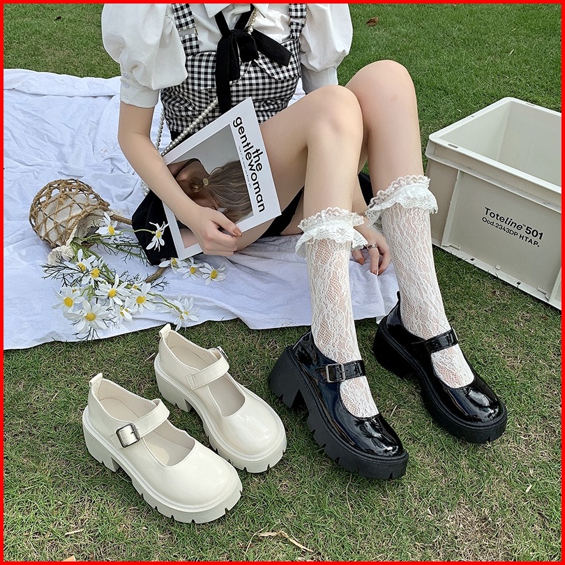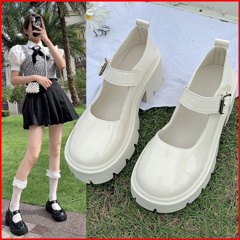 Sepatu Mary Jane Hak Tahu Wanita Import Murah Kulit Putih Hitam 6cm Chunky Block Heels Black White Platform Shoes - Ukur