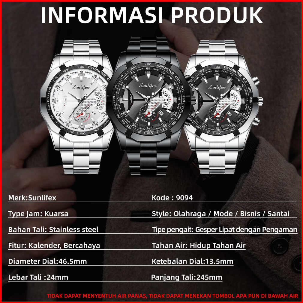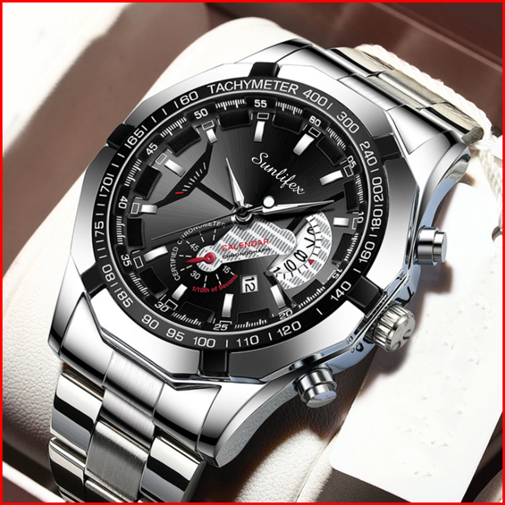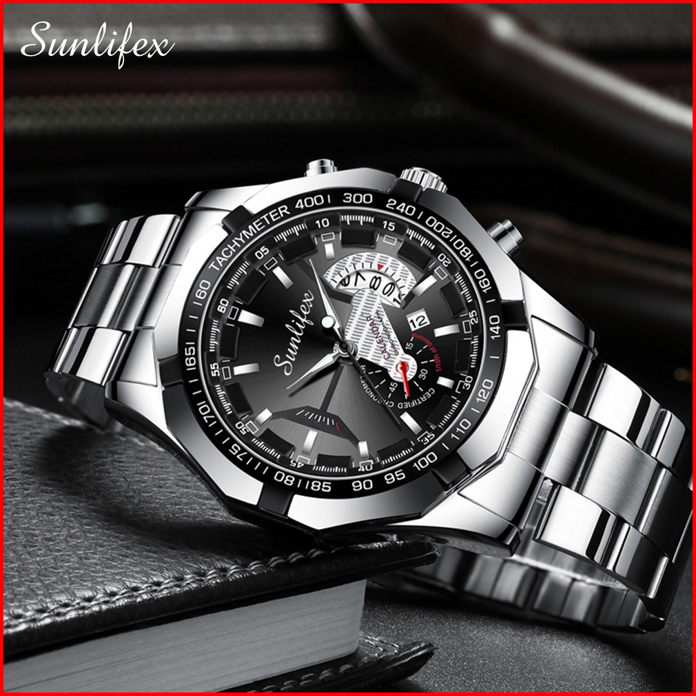 Sunlifex Jam Tangan Pria Kemewahan Mode Kuarsa Jam Anti Air Tali Stainless Steel Jam Tangan Cowok