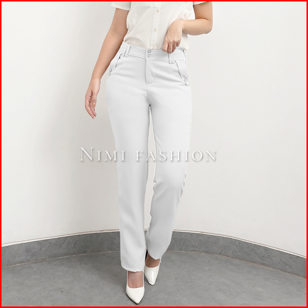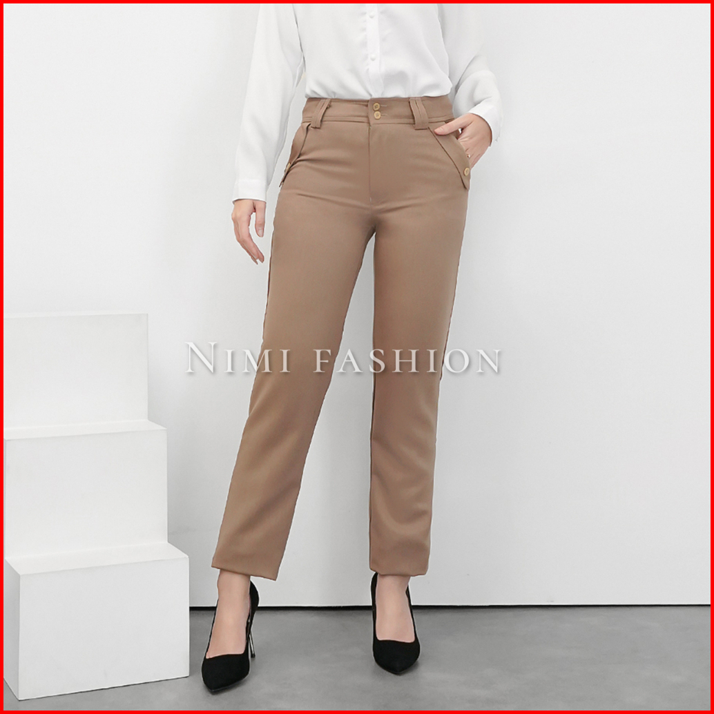 Nimi - Celana Kerja Kantor Reguler Formal Cream Pinggang Kancing Resleting Wanita