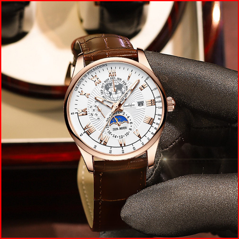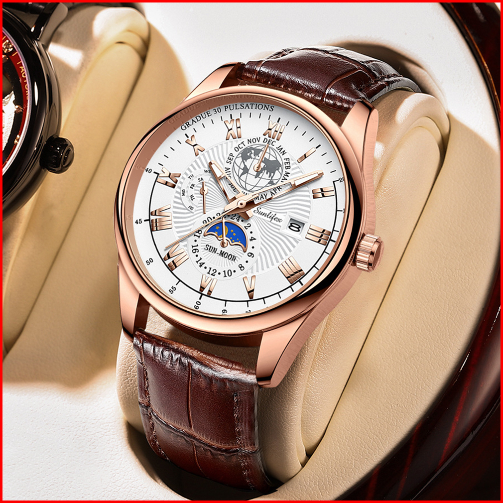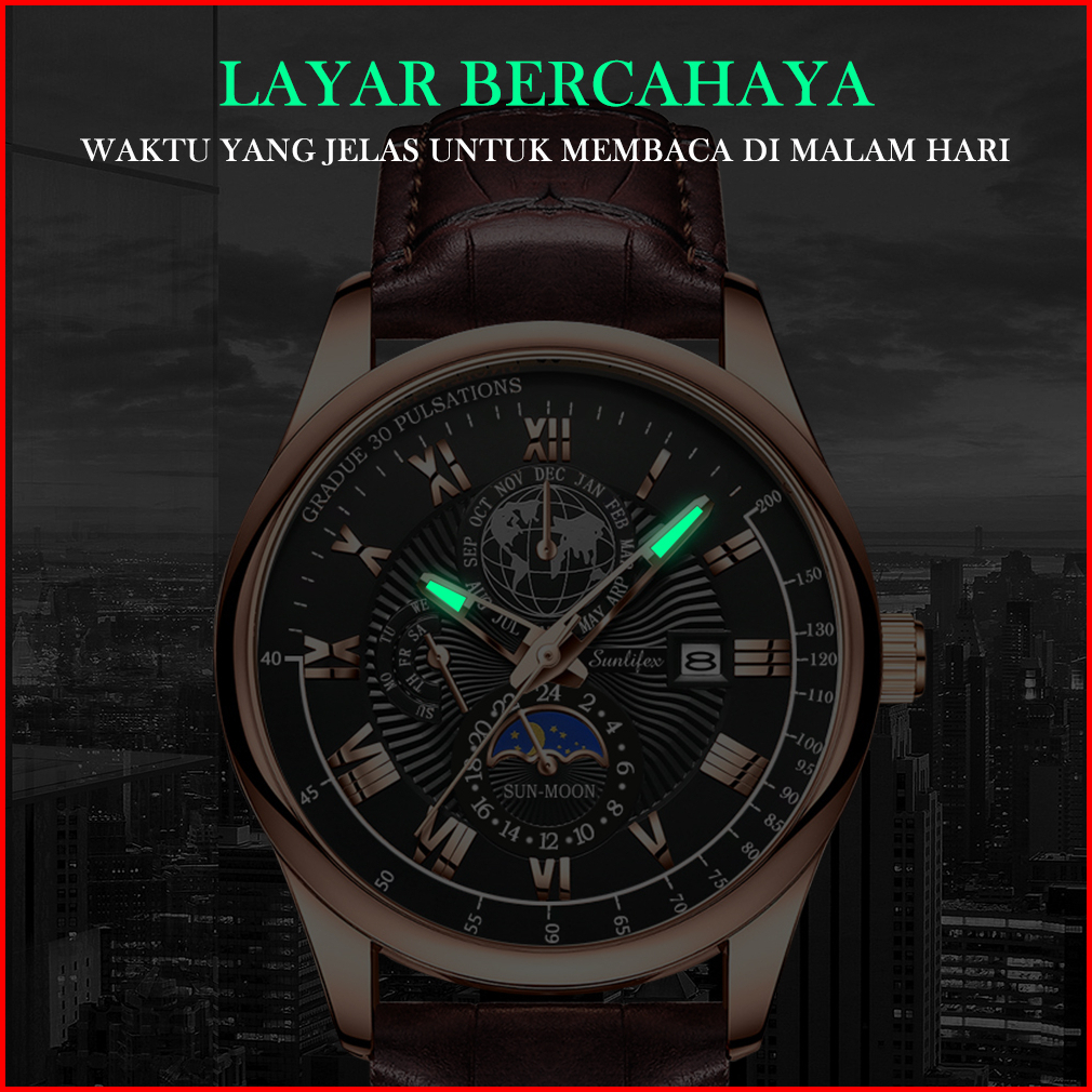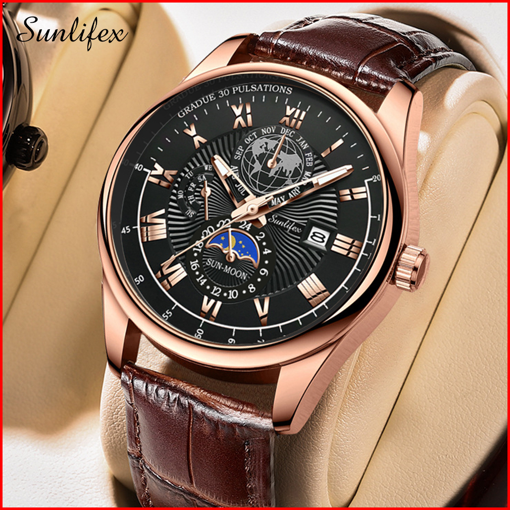 Sunlifex Jam Tangan Pria Kuarsa Kalender Tali Kulit Kasual Mode Jam Tangan Cowok