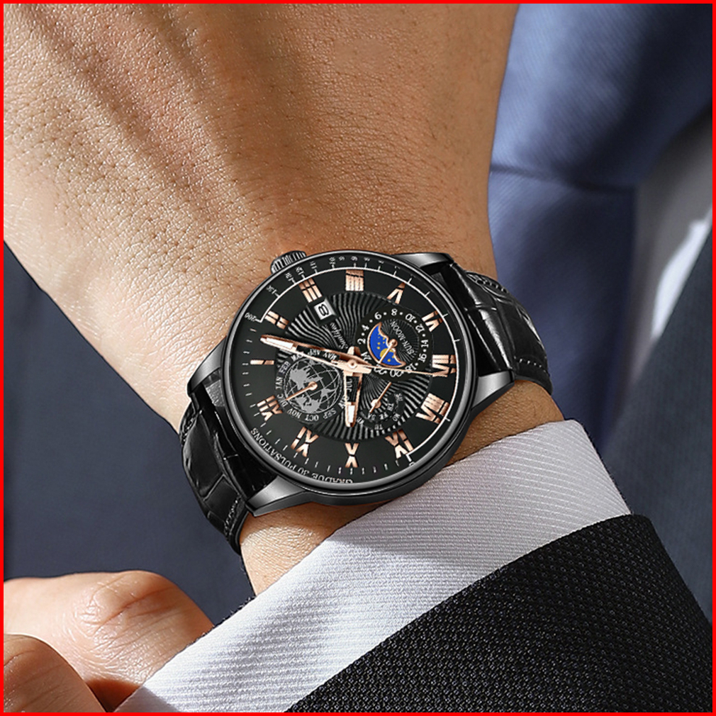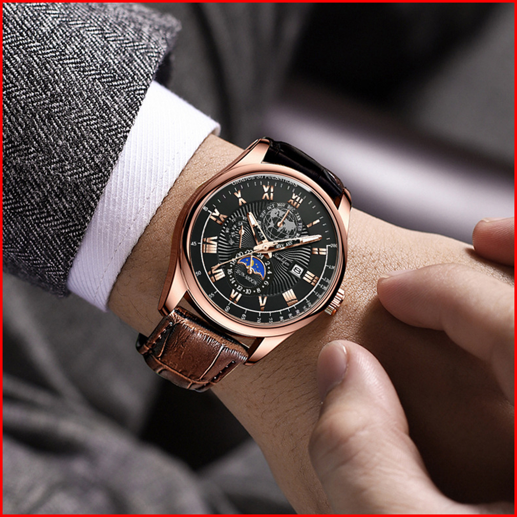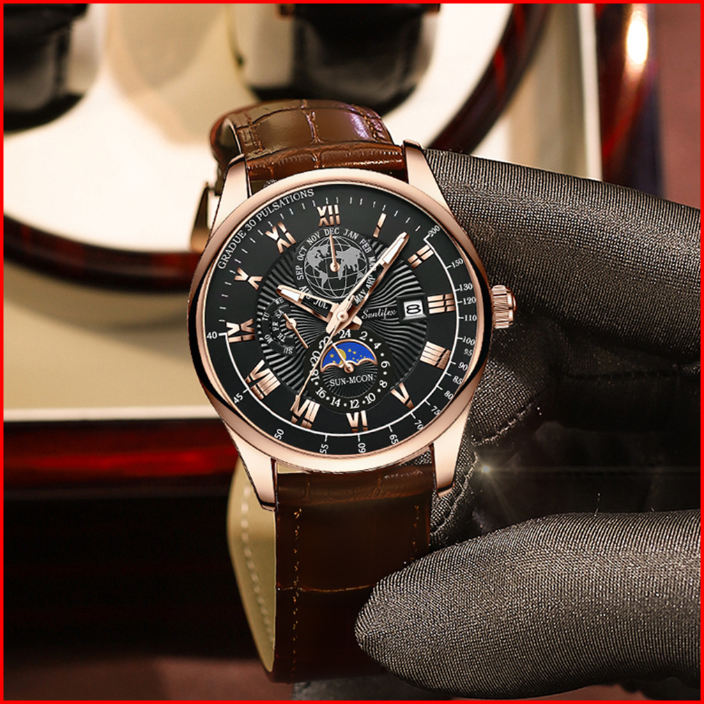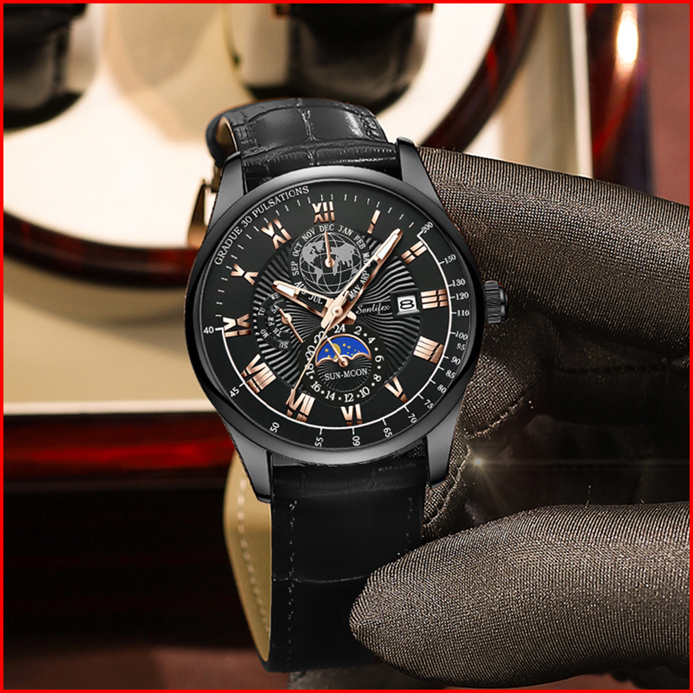 Sunlifex Jam Tangan Pria Kuarsa Kalender Tali Kulit Kasual Mode Jam Tangan Cowok