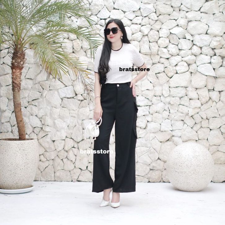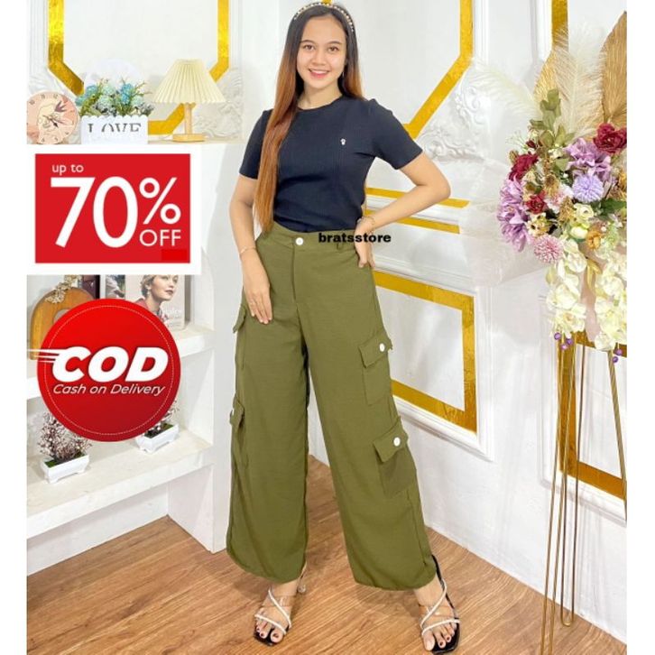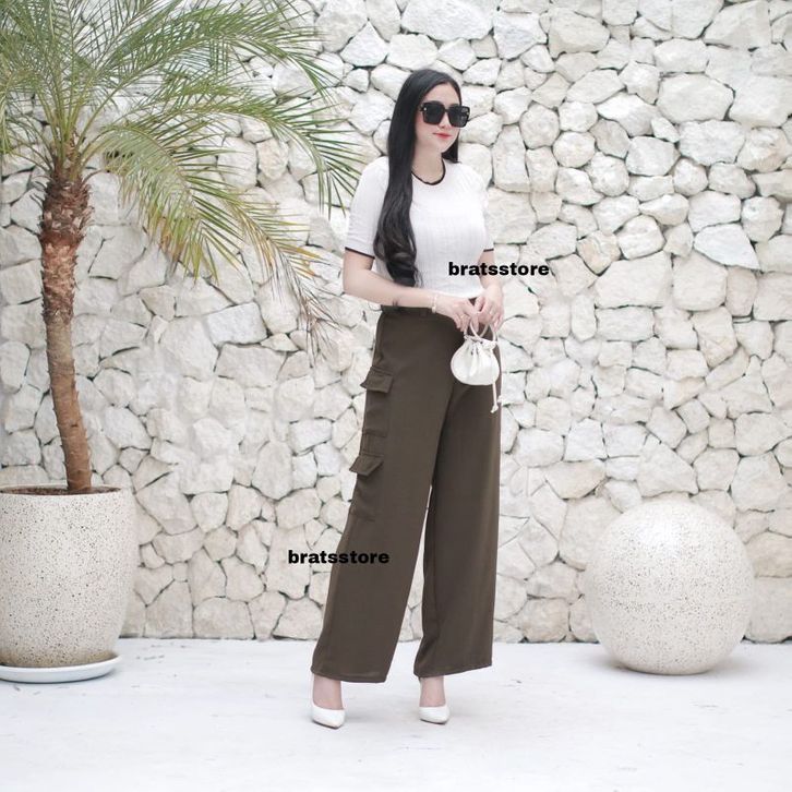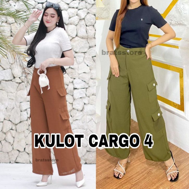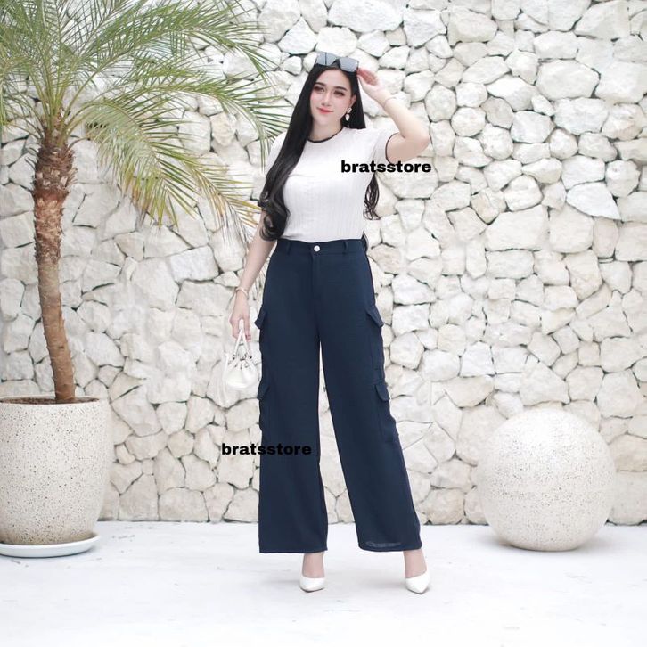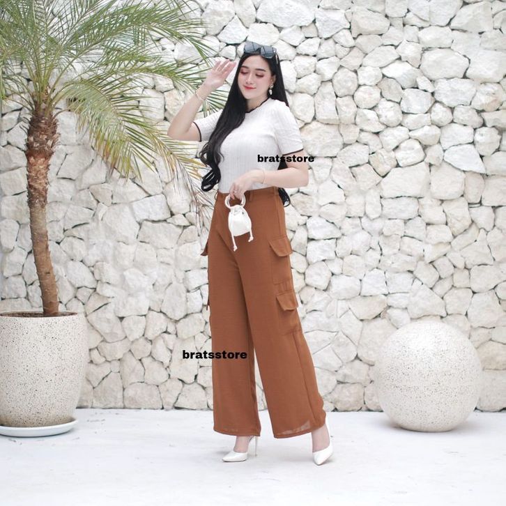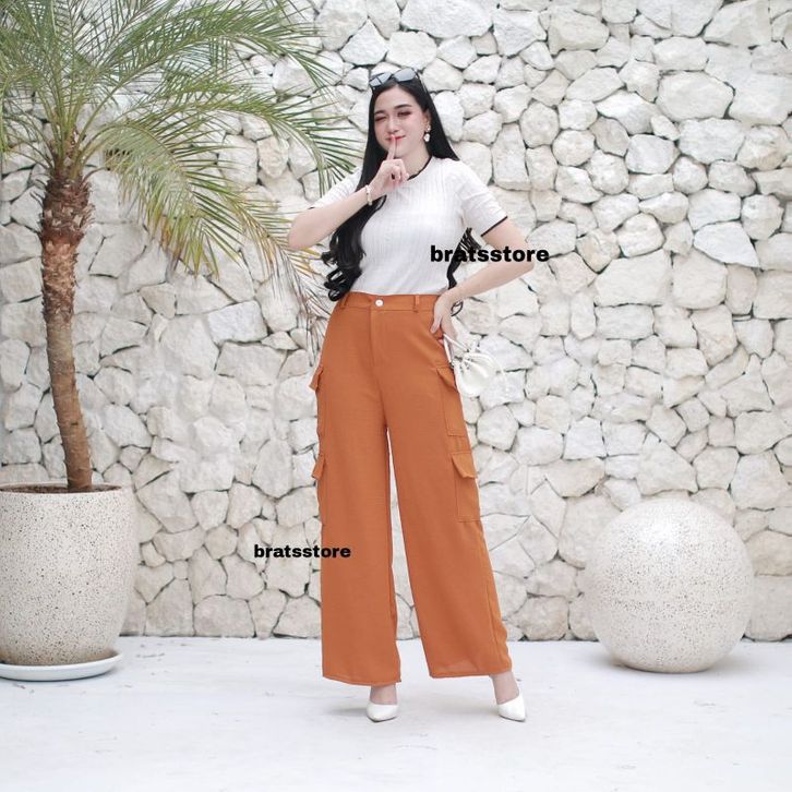 Celana Kulot Cargo 4 Kantong Bahan Katun Crinkle Halus Tebal Bawahan Cewek Kasual Kekinian Long Pants Korean Stylish