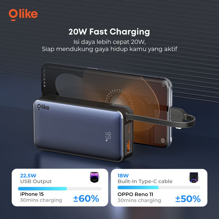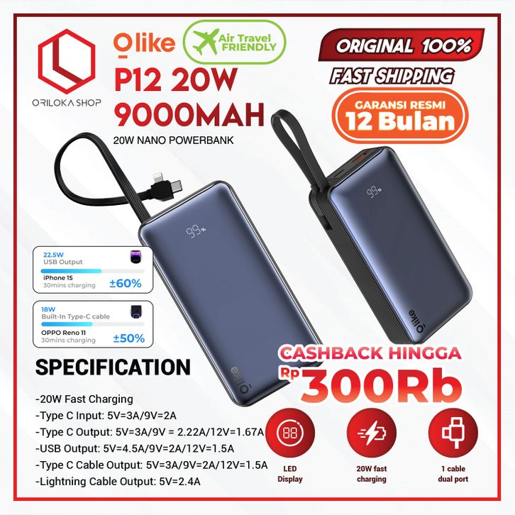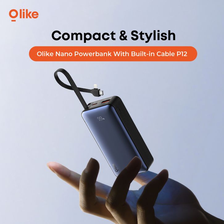 Olike P12 Nano Power bank 9000mAh | 20W Fast Charginh | Built-in Cable Type-C | Powerbank Olike
