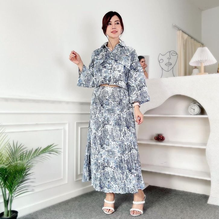 One Set Wanita Nature Korean Vintage Setelan Kemeja Crop Rok Midi Plisket Perempuan Motif Bunga Premium