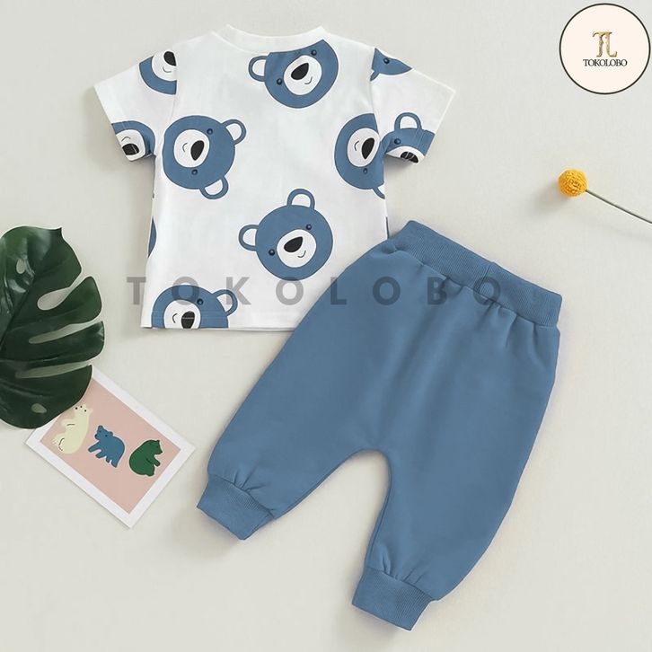 Setelan Baju Anak Laki Perempuan Motif Beruang Lucu One Set Celana Panjang Kaos Pendek Babbyterry Tebal Halus Trend