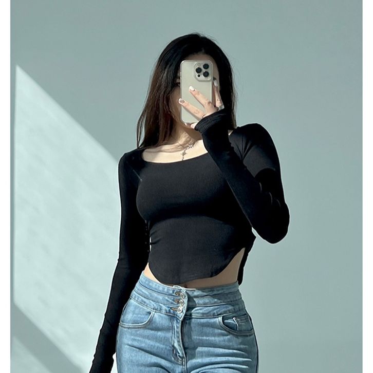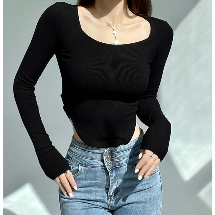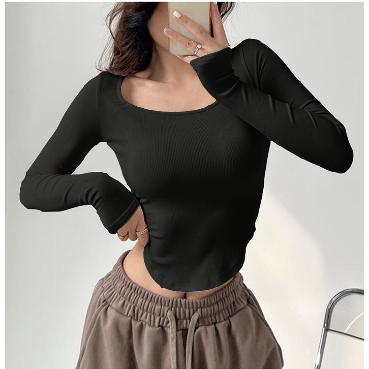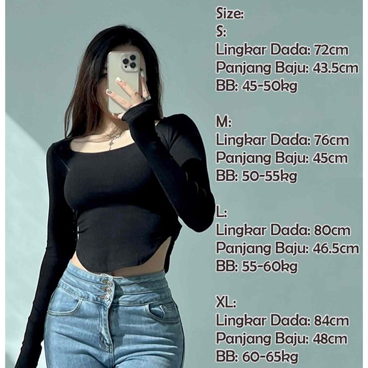Kaos Wanita Square Neck Long Sleve Shirt Blouse Crop Top Lengan Panjang Atasan Casual Santai Korean Style Stylish