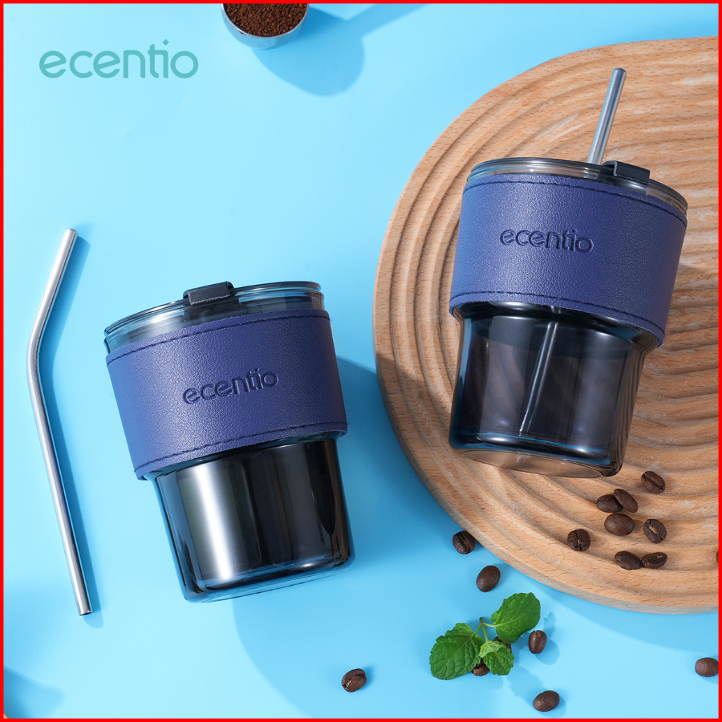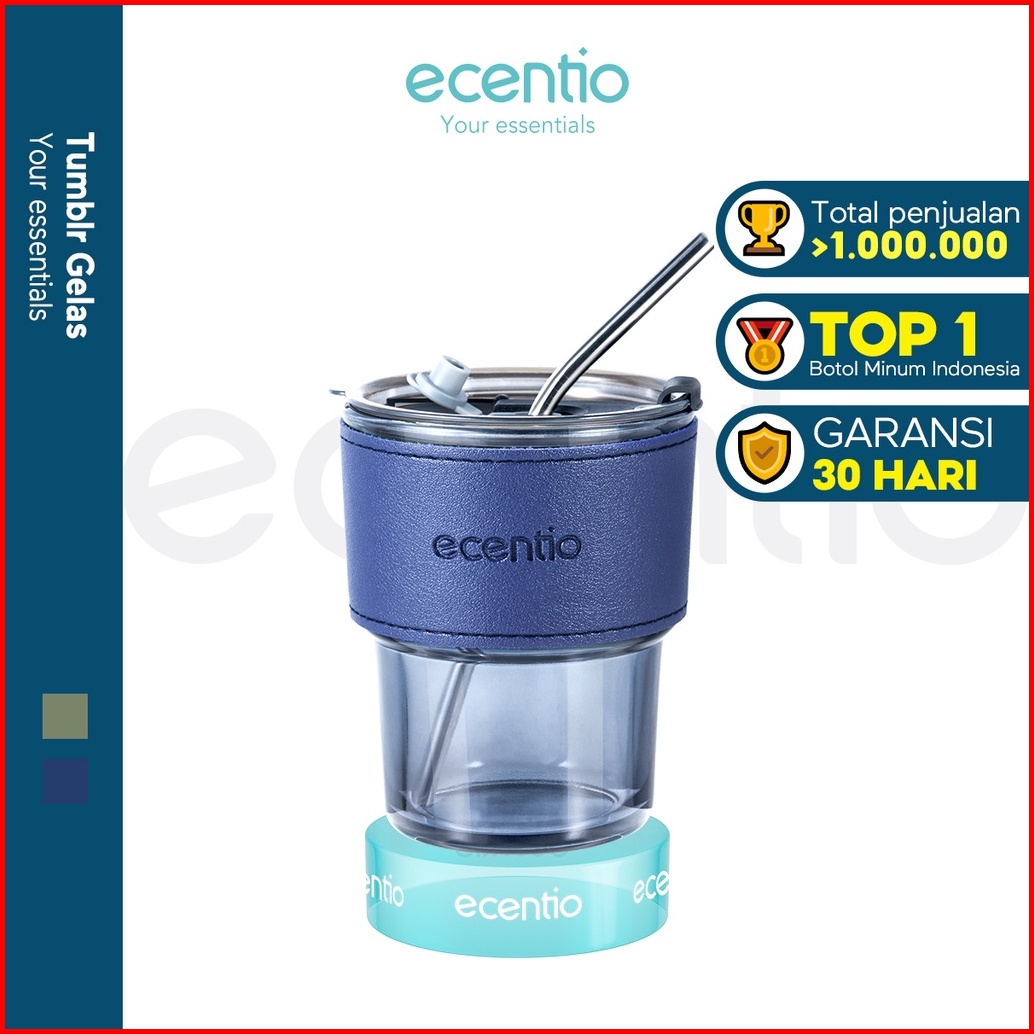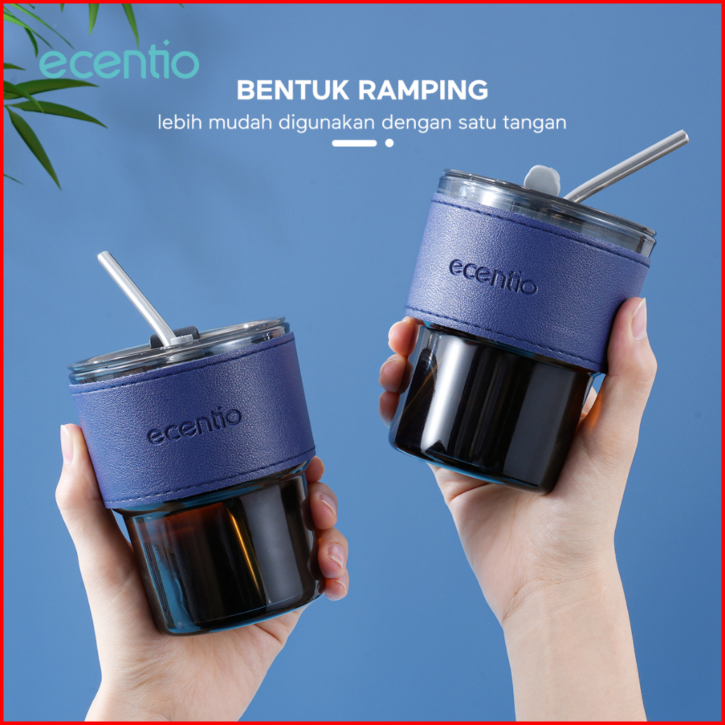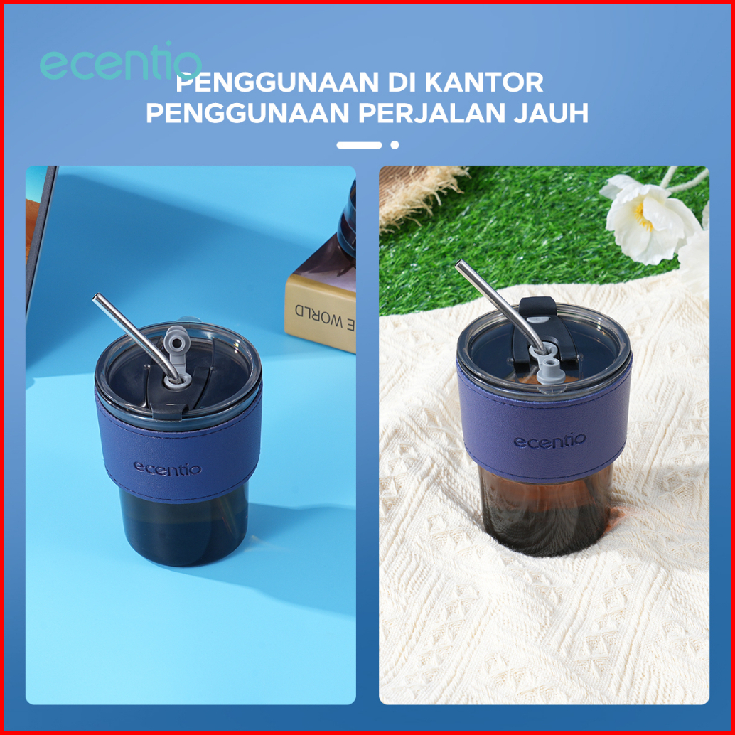 Ecentio Gelas Tumbler 400ml Cangkir Kopi Kaca Aesthetic Water Bottle Cup Dengan Sedotan Biru