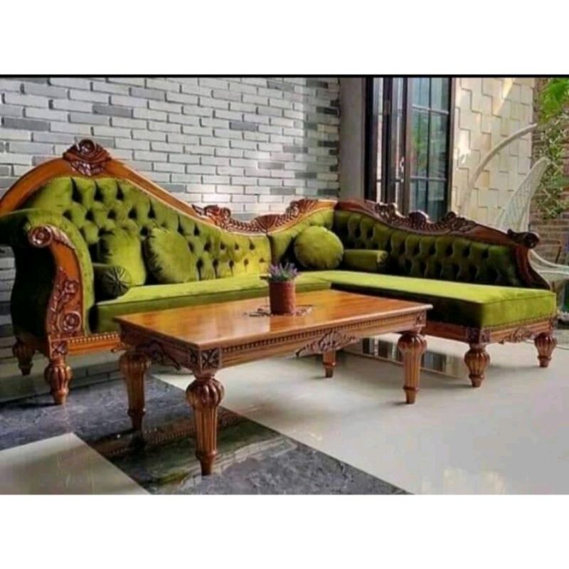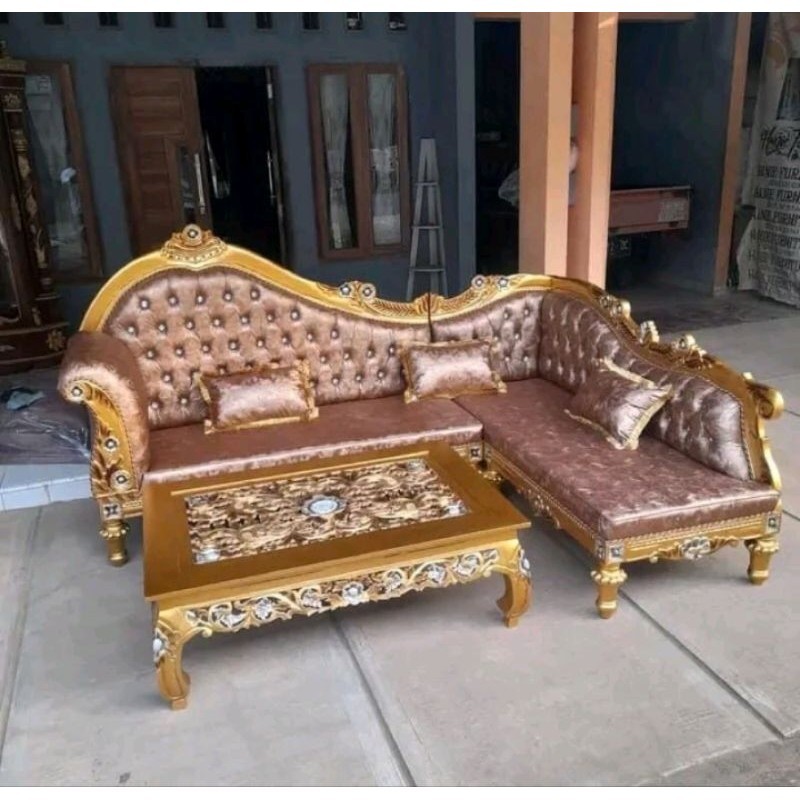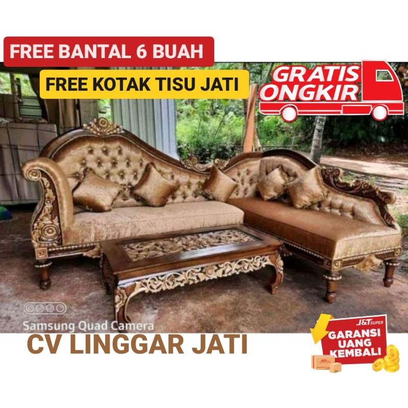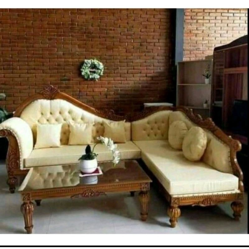 kursi ruang tamu Kursi tamu sudut sofa jati ukir mewah 235x170 meja 120x80 sudah termasuk kaca dan 3 bantal peluk ukuran