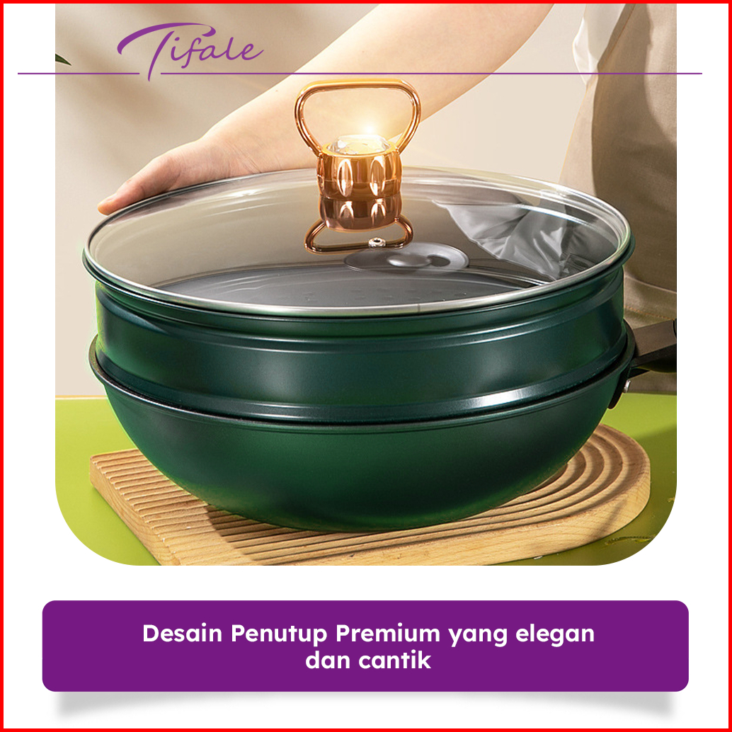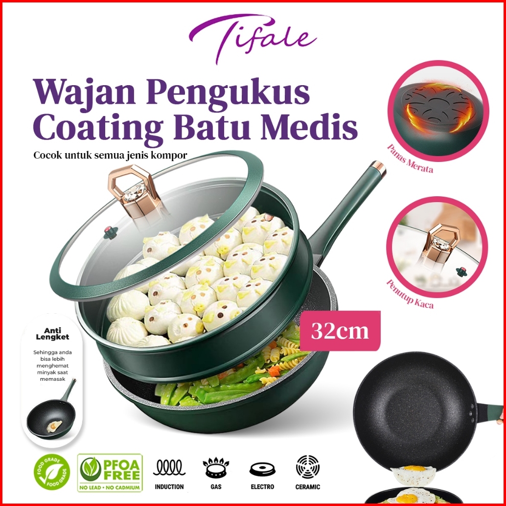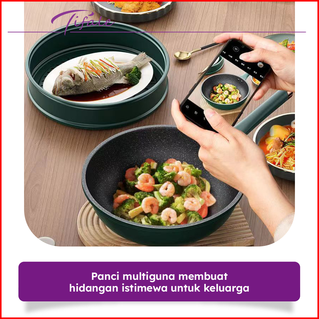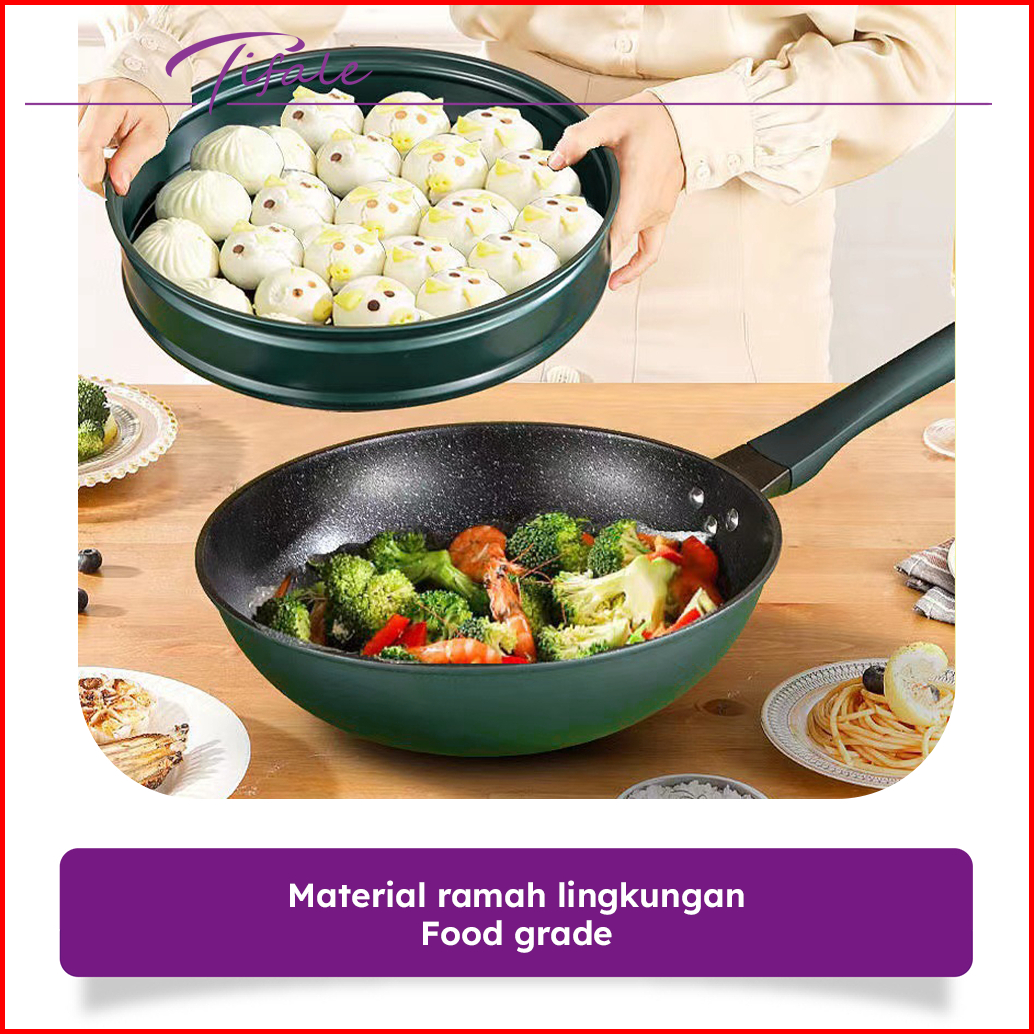 Tifale 3in1 Wajan Wokpan Steamer 32 Cm Bahan Batu Medis Anti Lengket Hijau Premium Panci Penggorengan Kukus Serba Guna 3