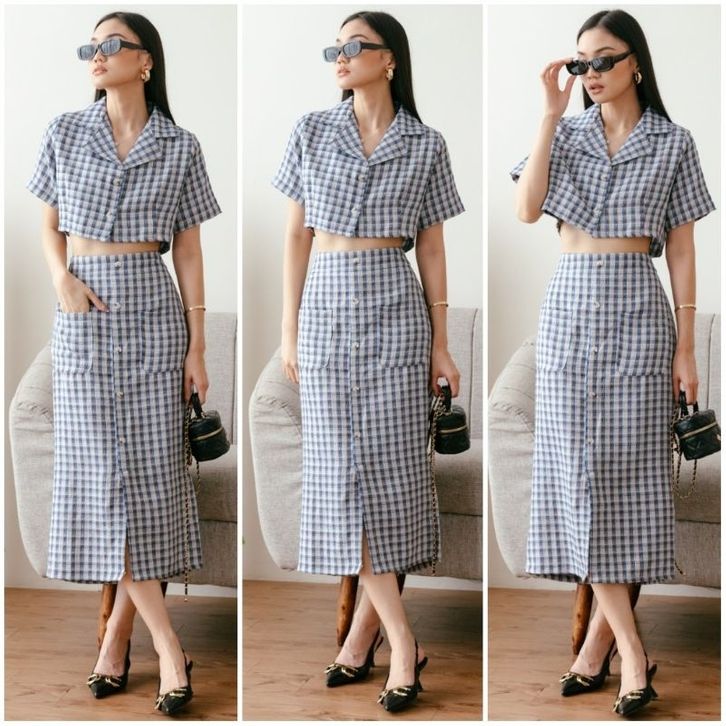 ONE SET WELISSA 2 IN 1 PLAID SET TWEED BUTTON CROP COLLAR BLOUSE WITH MIDI POCKET SKIRT | SHELICIOUSROOM BEST SELLER