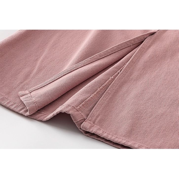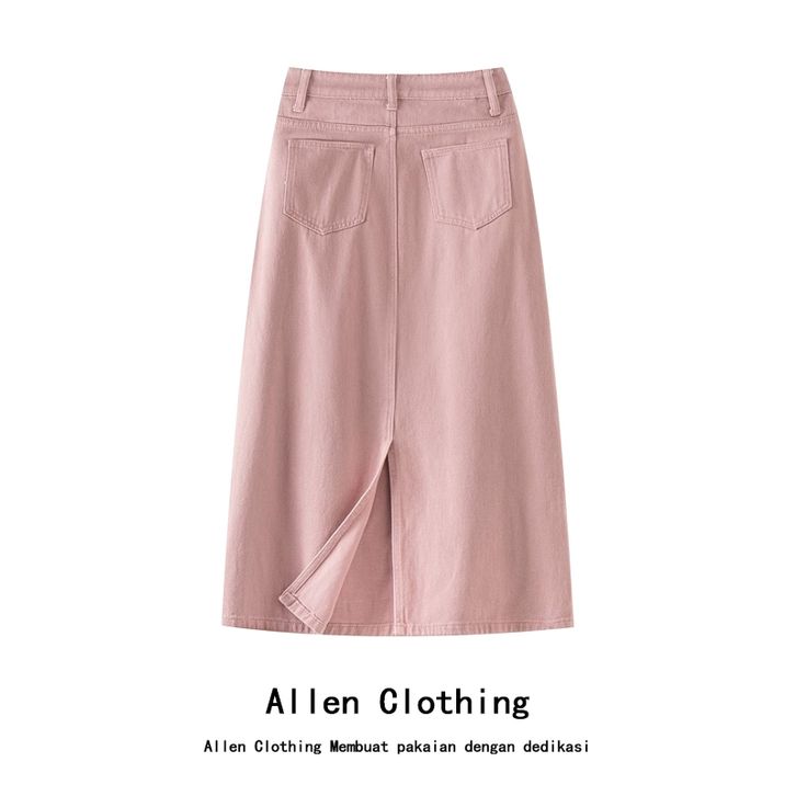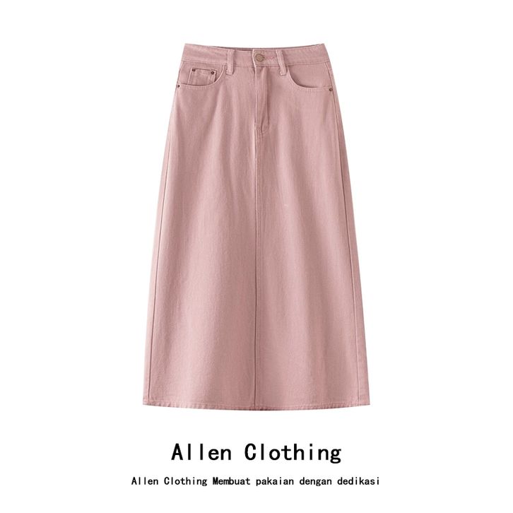 Allen Clothing Rok Denim Pinggang Tinggi Wanita Impor Korea Rok Panjang Sedang Warna Polos dengan Belahan di Bagian Bela