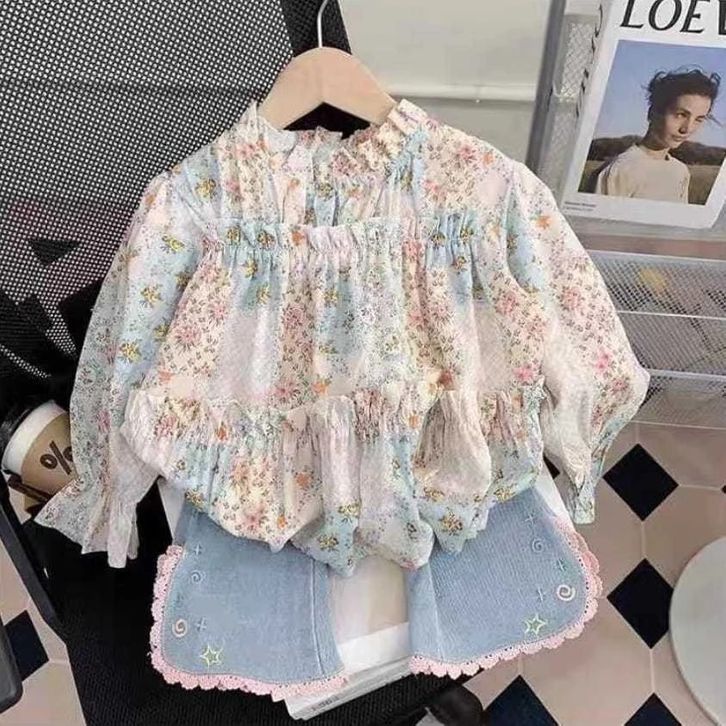 Setelan Set Anak Perempuan Blouse Bunga + Celana Panjang Jeans