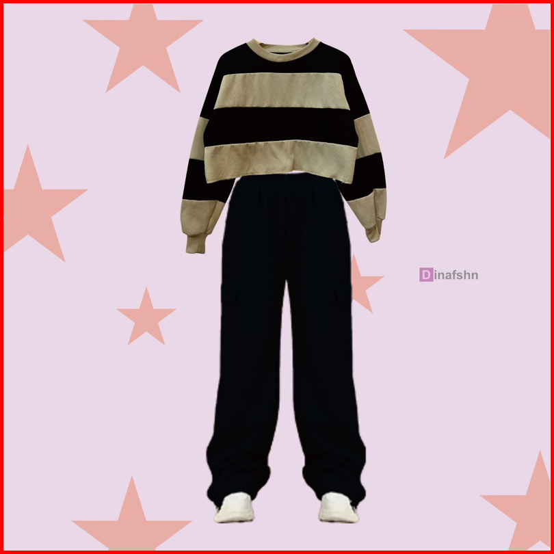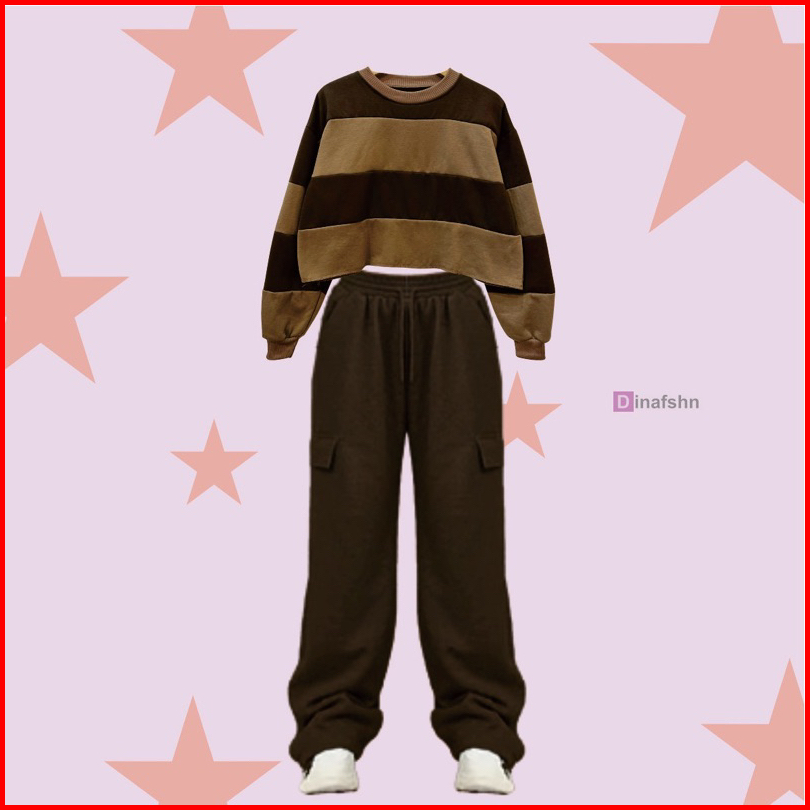 One Set Stripe Croope Sweater Jooy Cargo Sweetpants Wanita