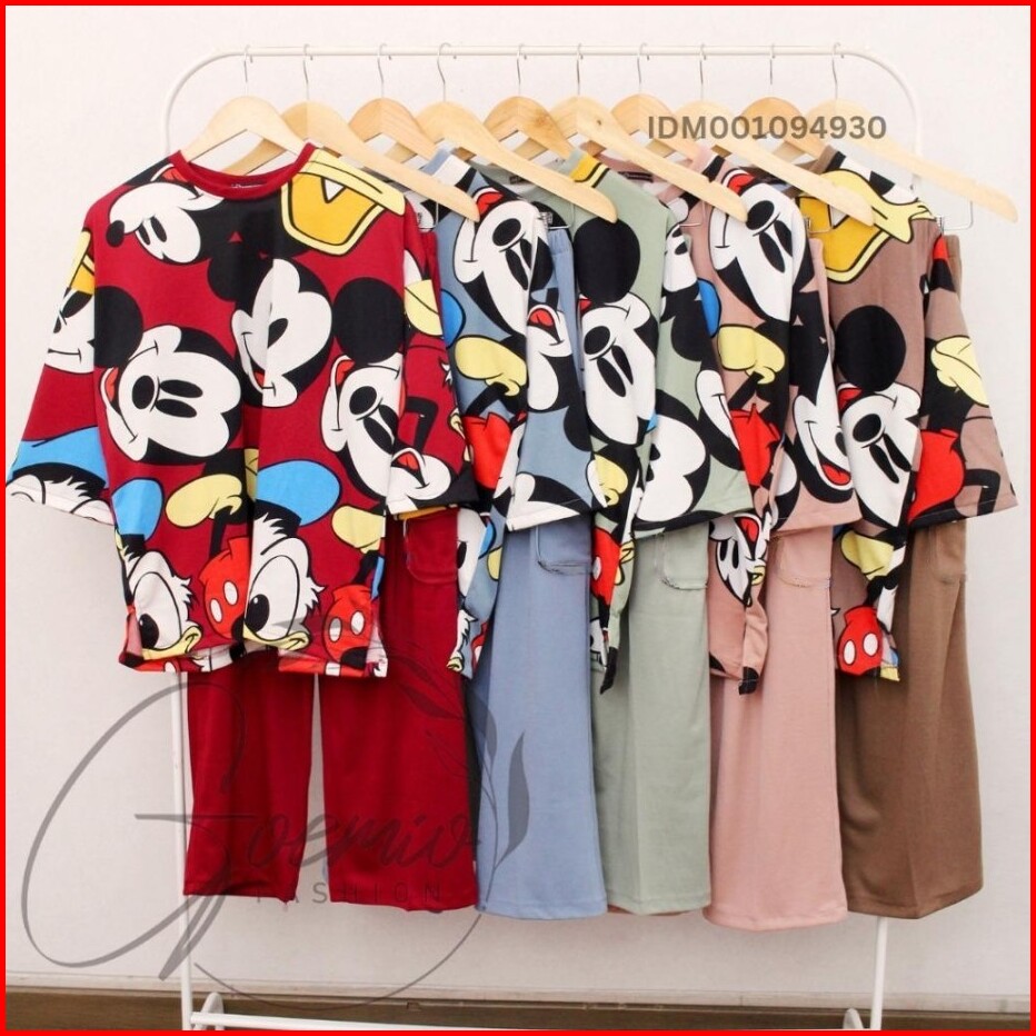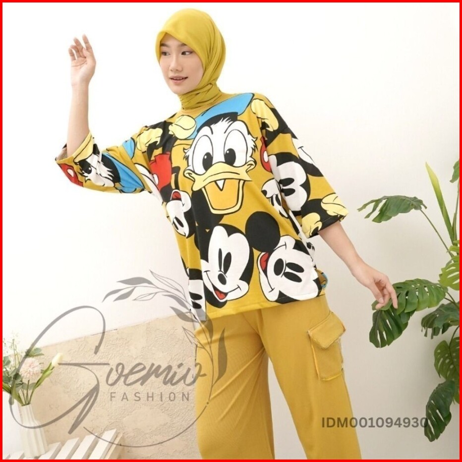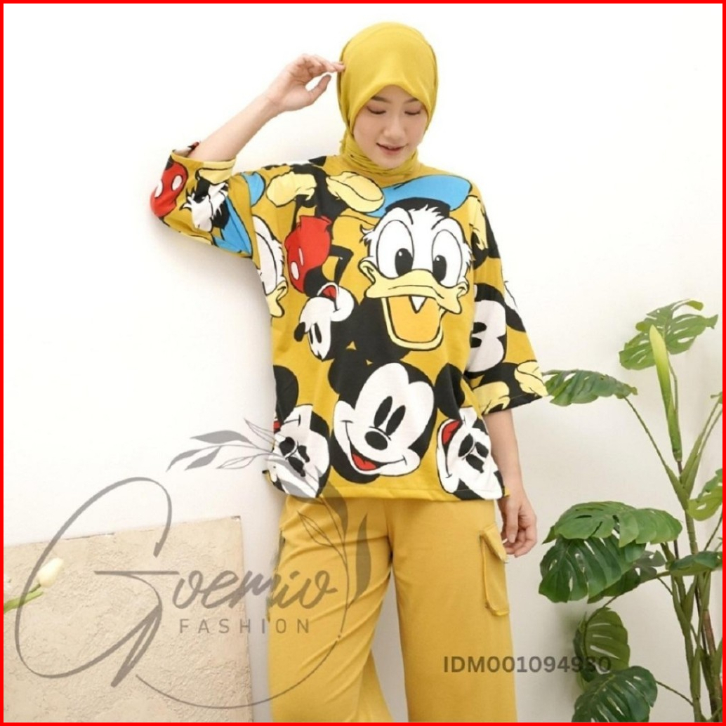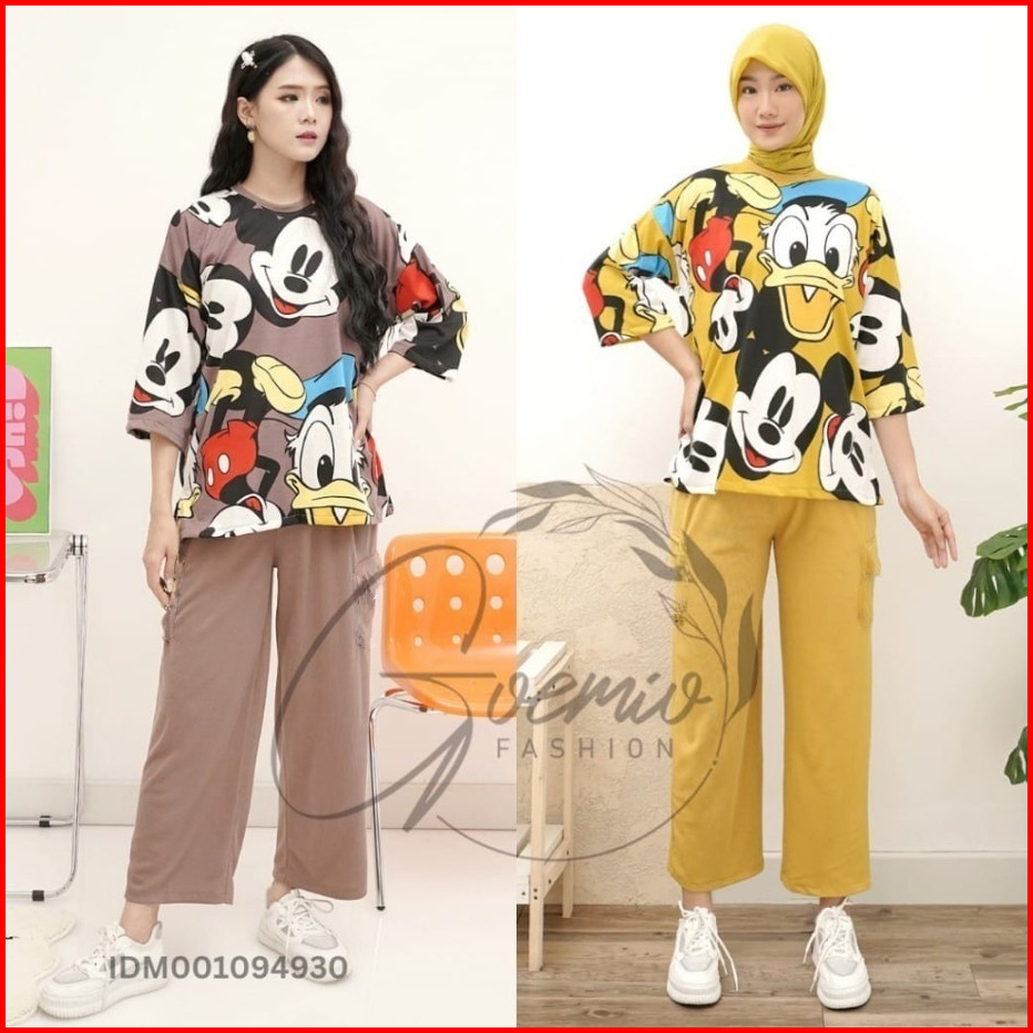 Ilook Ld 120 One Set Penny D Setelan Katun Knit Combi Atasan Motif Dan Celana Panjang Cargo Wanita Motif Lengan 3 4
