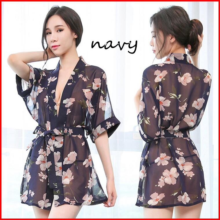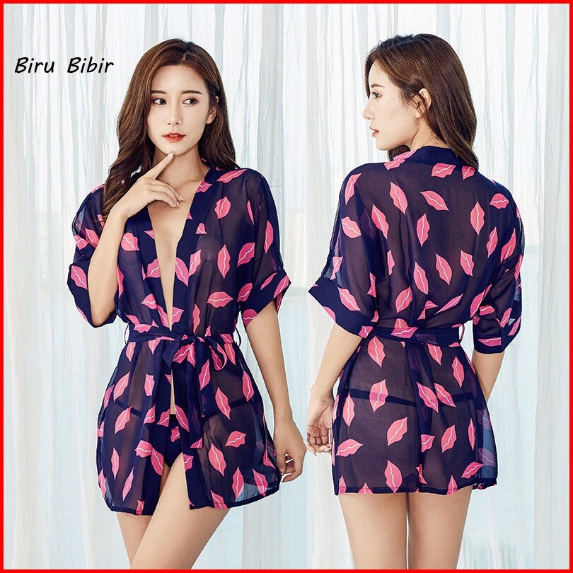 Wanita Piyama Transparan Set Baju Tidur Sexy Kimono G-string Bahan Sifon A187-2