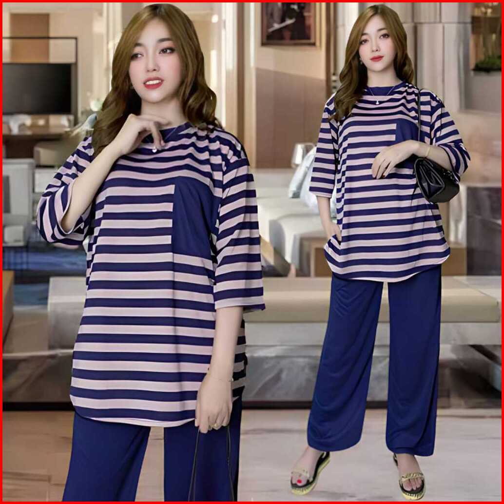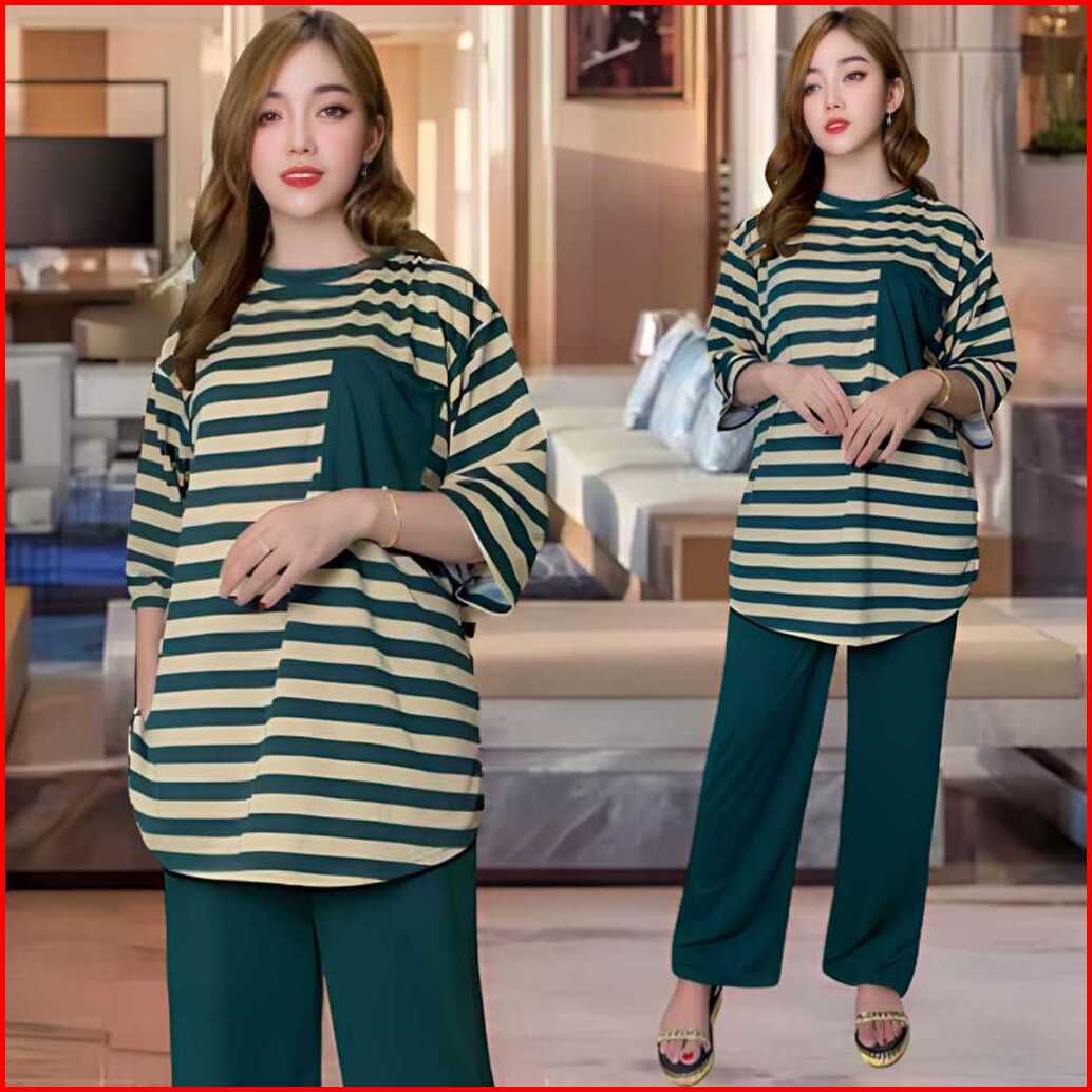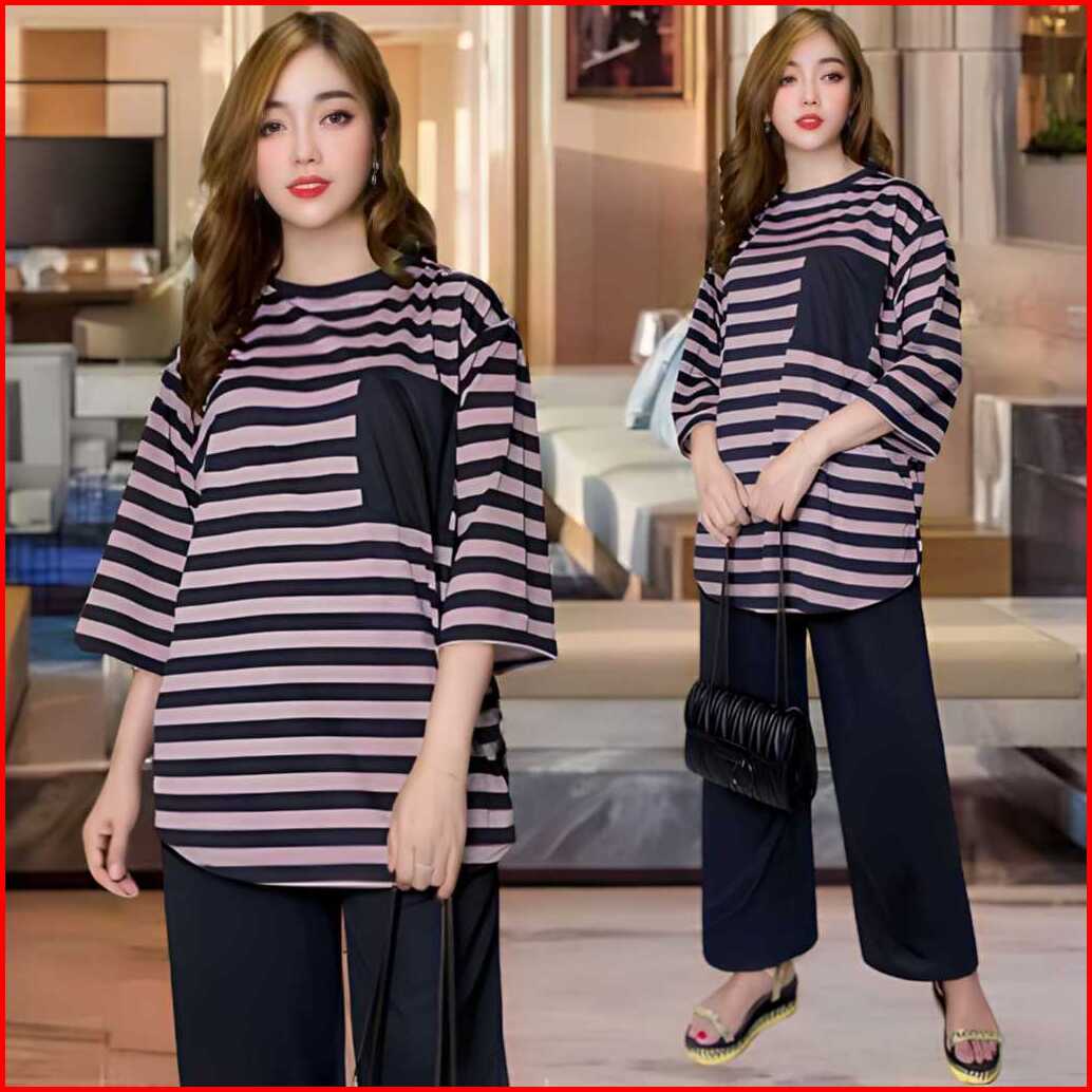 Aufaa Oneset Atasan Oval Kantong Dada Ld 120 Vistaterry Motif Salur Celana Karet Wanita Setelan Baju Basic Panjang Overs