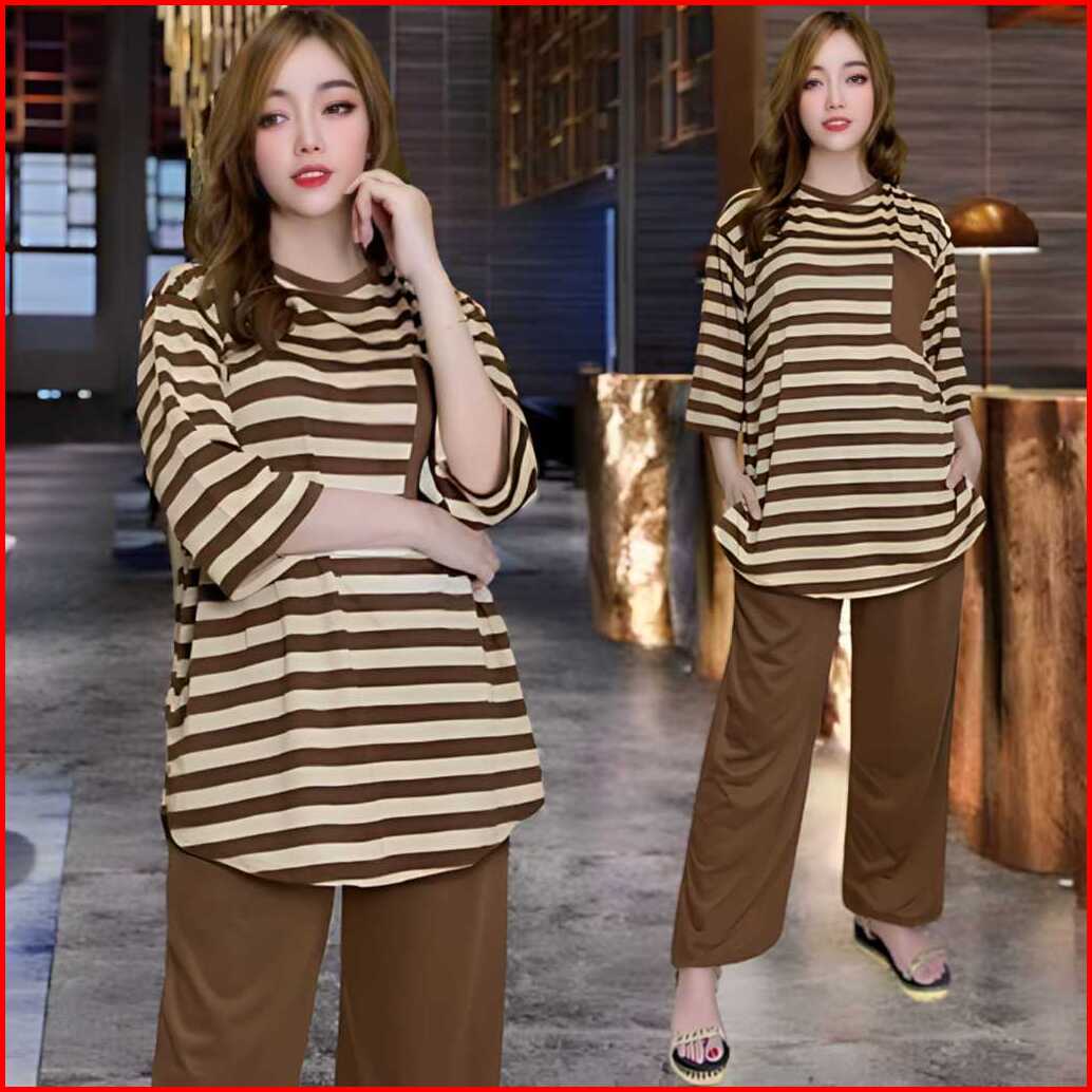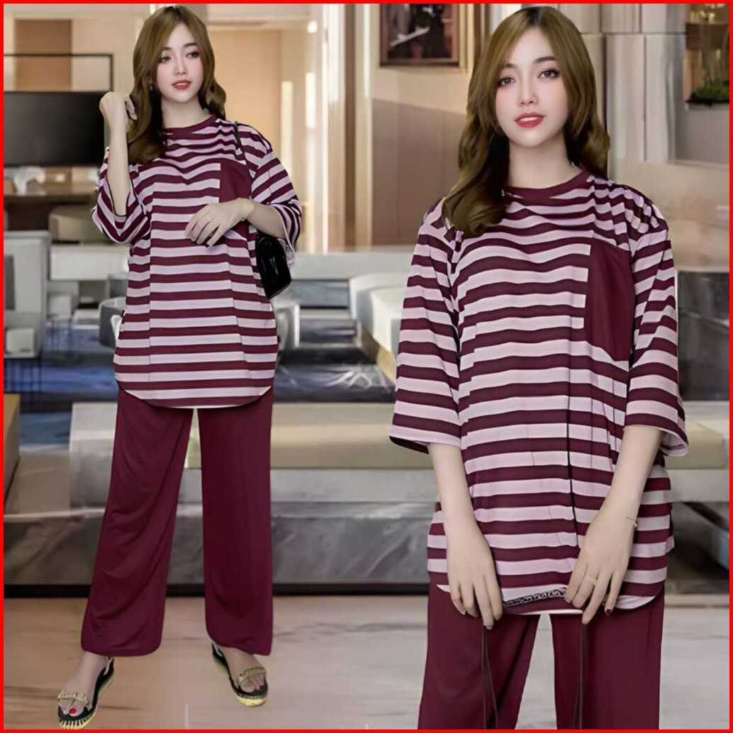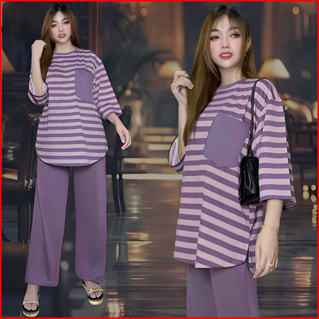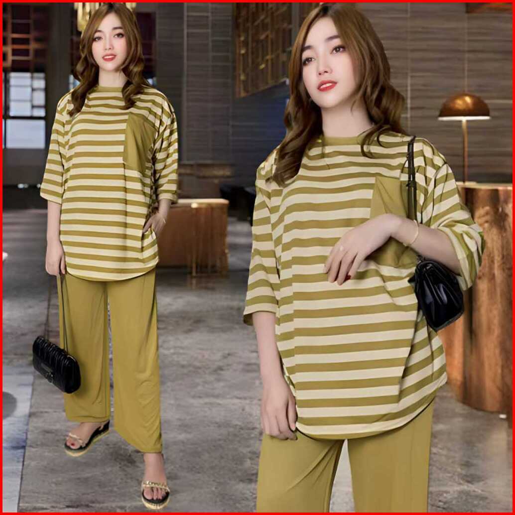 Aufaa Oneset Atasan Oval Kantong Dada Ld 120 Vistaterry Motif Salur Celana Karet Wanita Setelan Baju Basic Panjang Overs