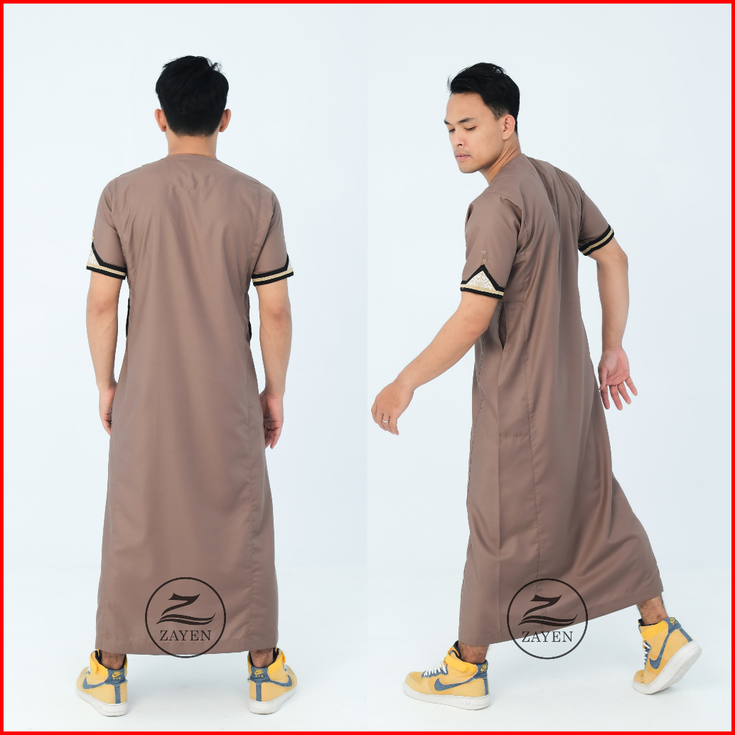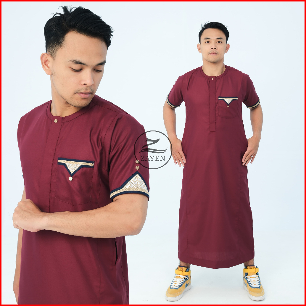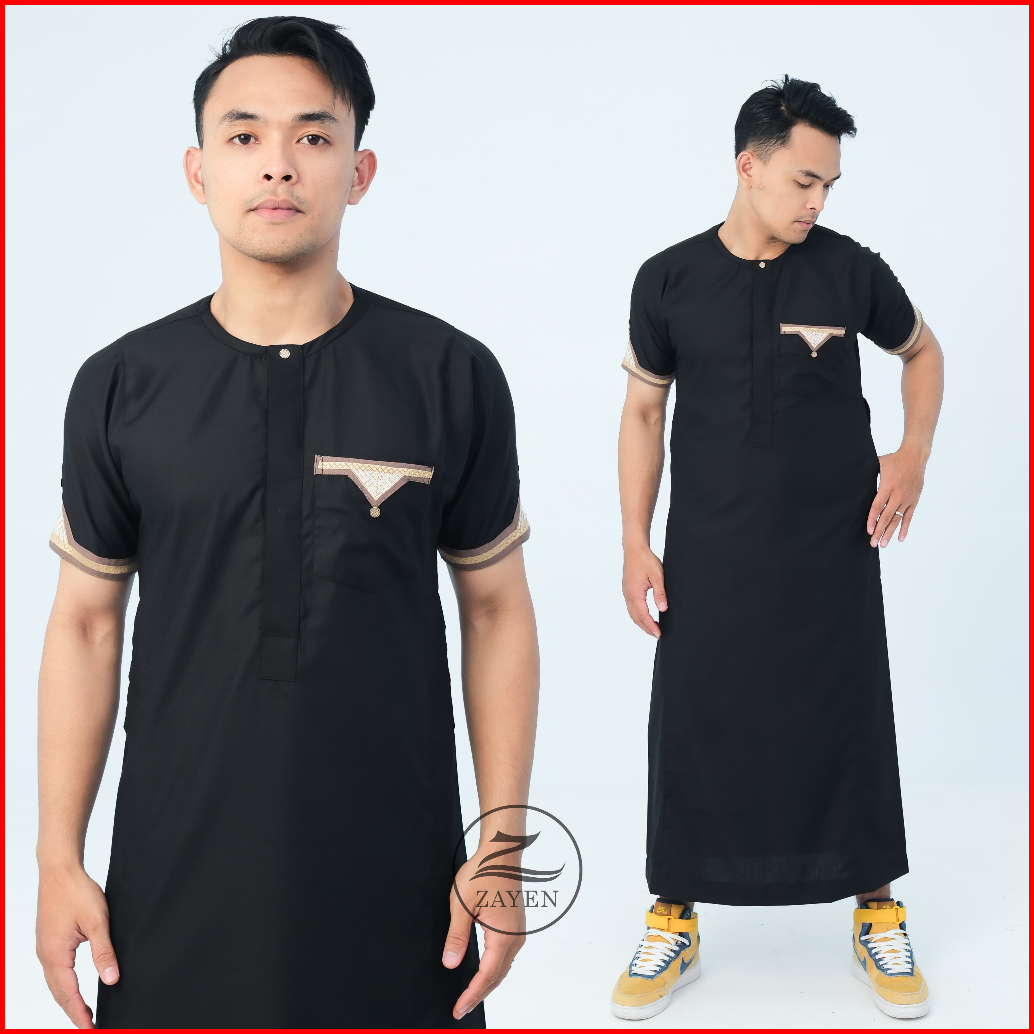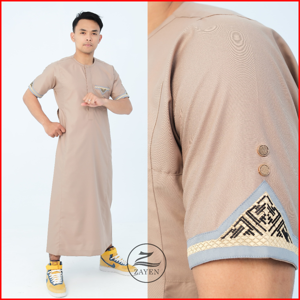 Jubah Slimfit Pria Lengan Pendek Gamis Pria Bordir Lengan Jubah Muslim Pria Dewasa Katun Kombinasi Bordir