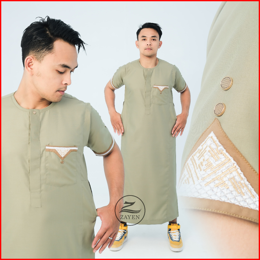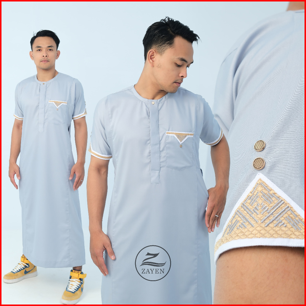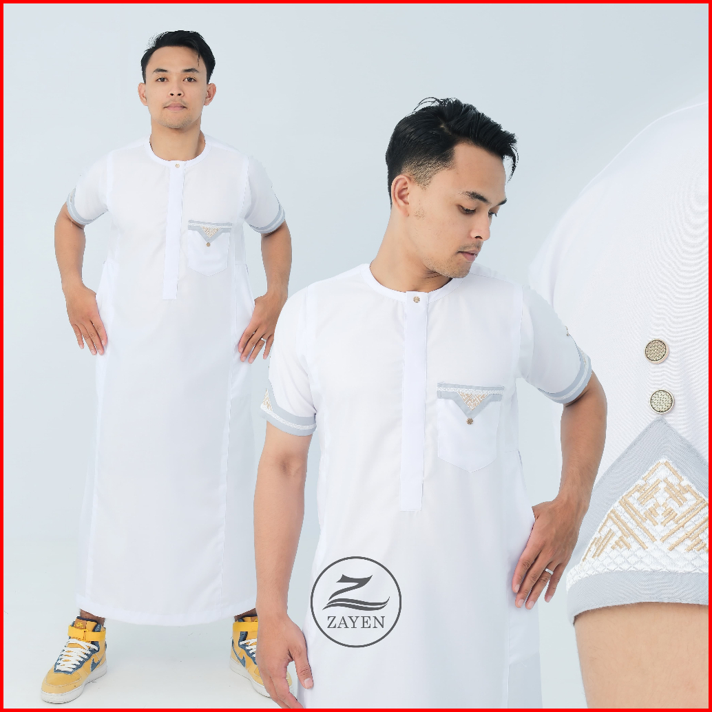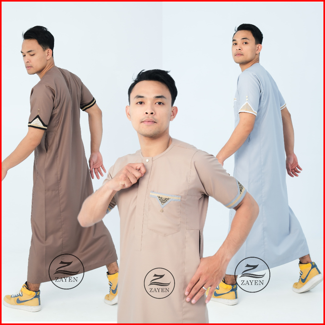 Jubah Slimfit Pria Lengan Pendek Gamis Pria Bordir Lengan Jubah Muslim Pria Dewasa Katun Kombinasi Bordir