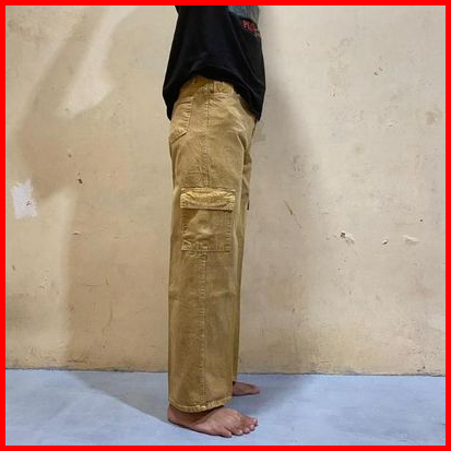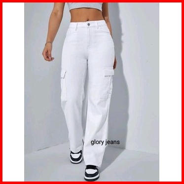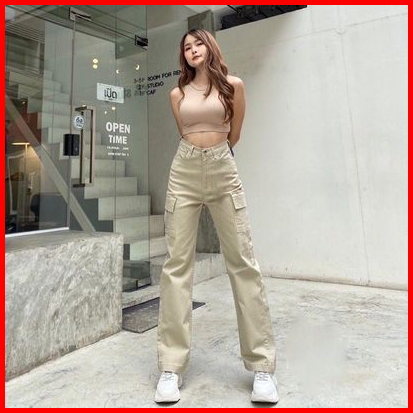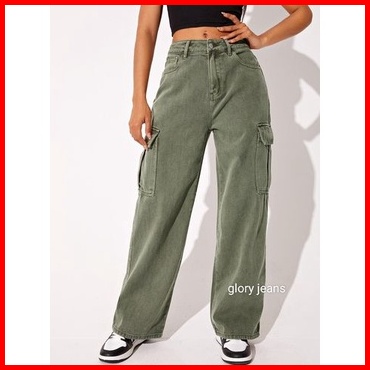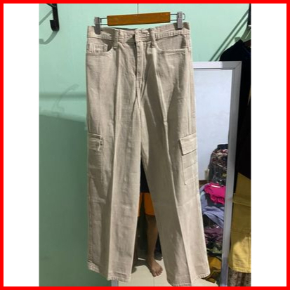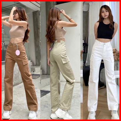 Celana Cargo Jeans Wanita Highwaist Loose Panjang Latte Cream Choco Khaki Jins Kimpul