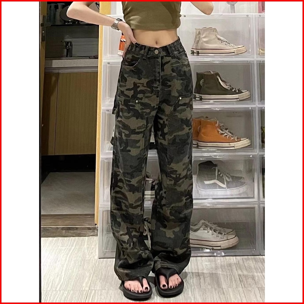 Amerika Trendi Retro Workwear Kamuflase Celana Jeans Wanita Desain Hip Hop High Street Longgar Gambar Menyanjung Lurus K