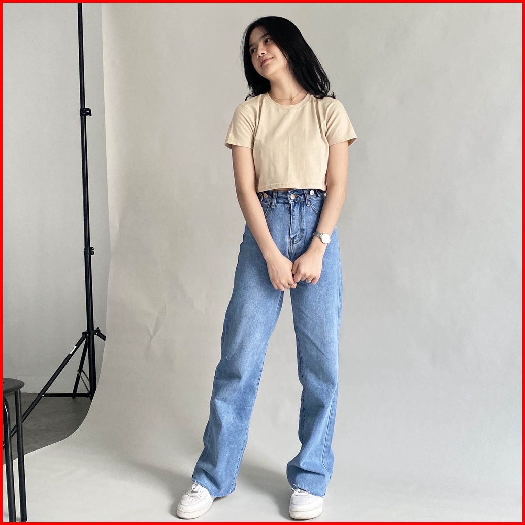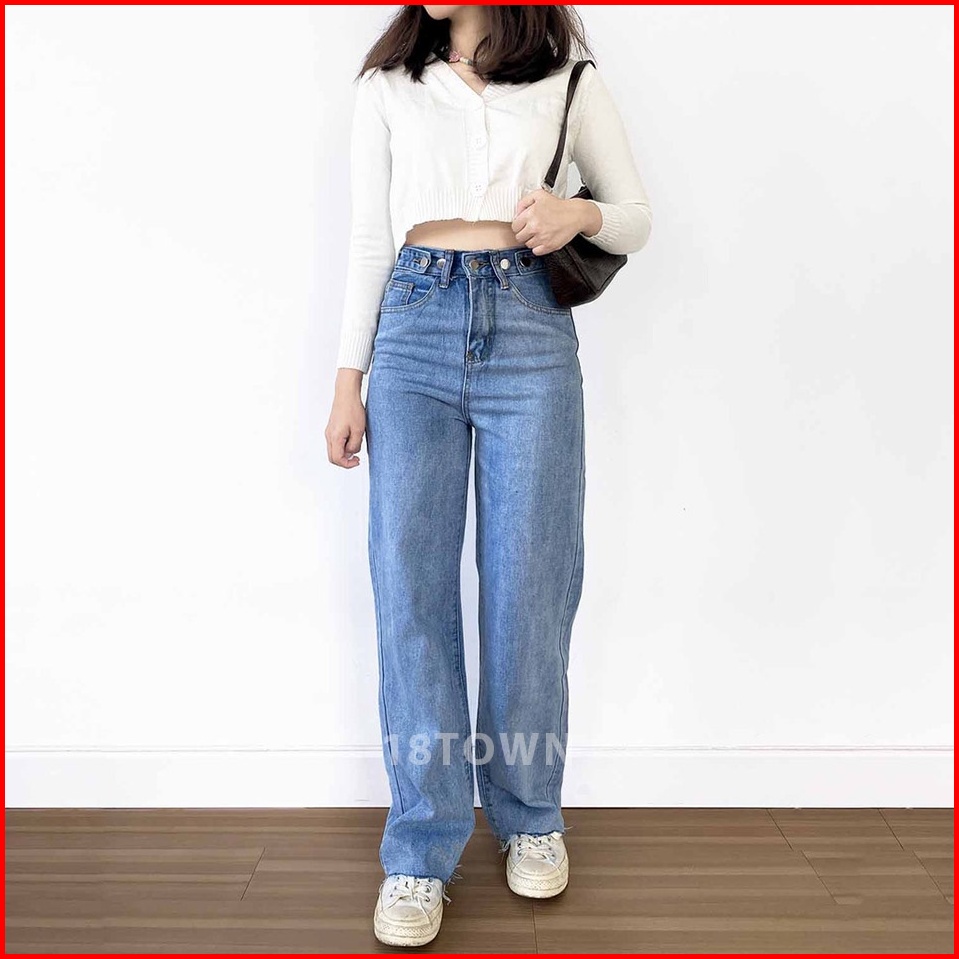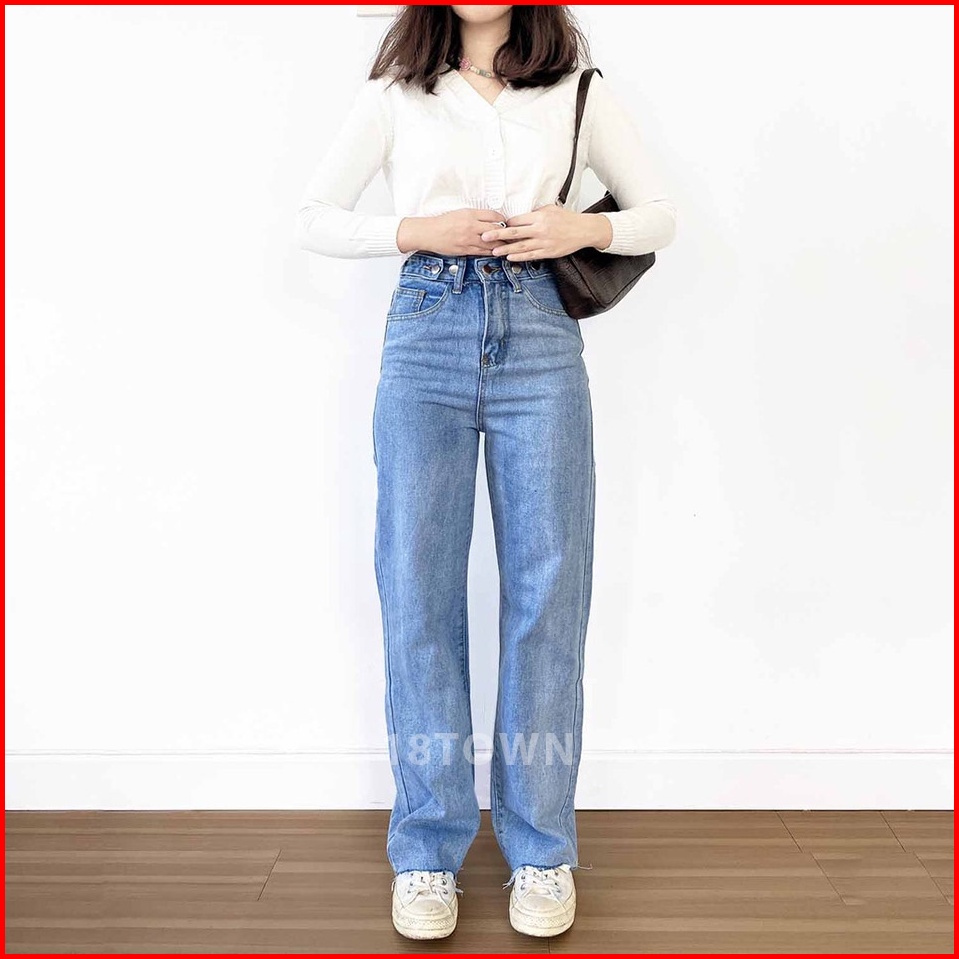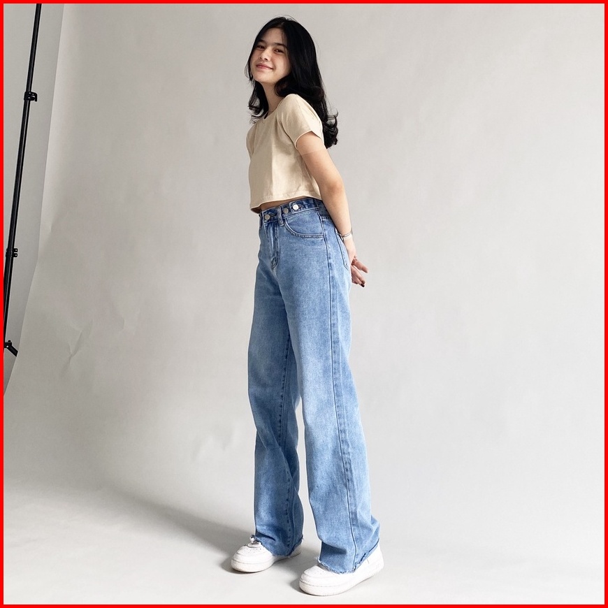 T44 18town Celana Jeans Biru Muda Korea Panjang Model Longgar Baggy Kulot High Waist Bahan Adem