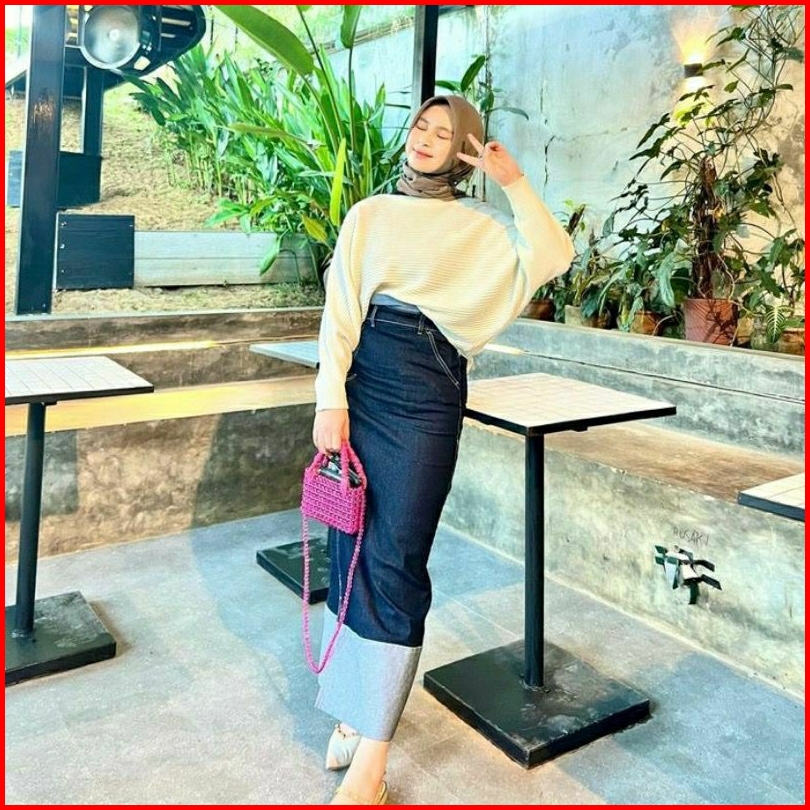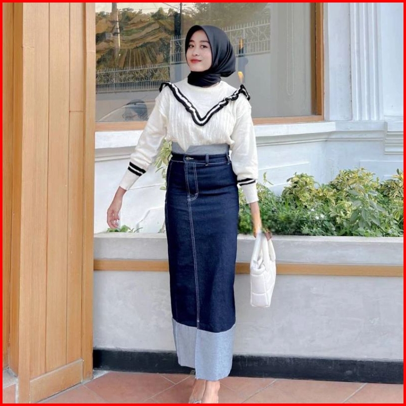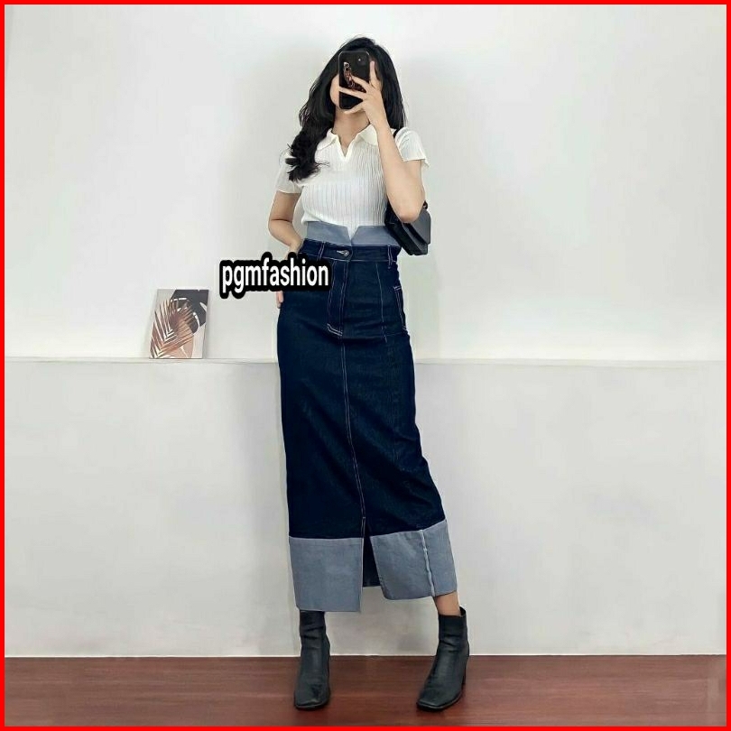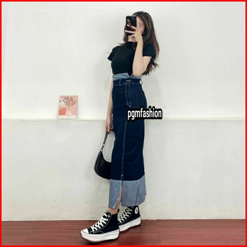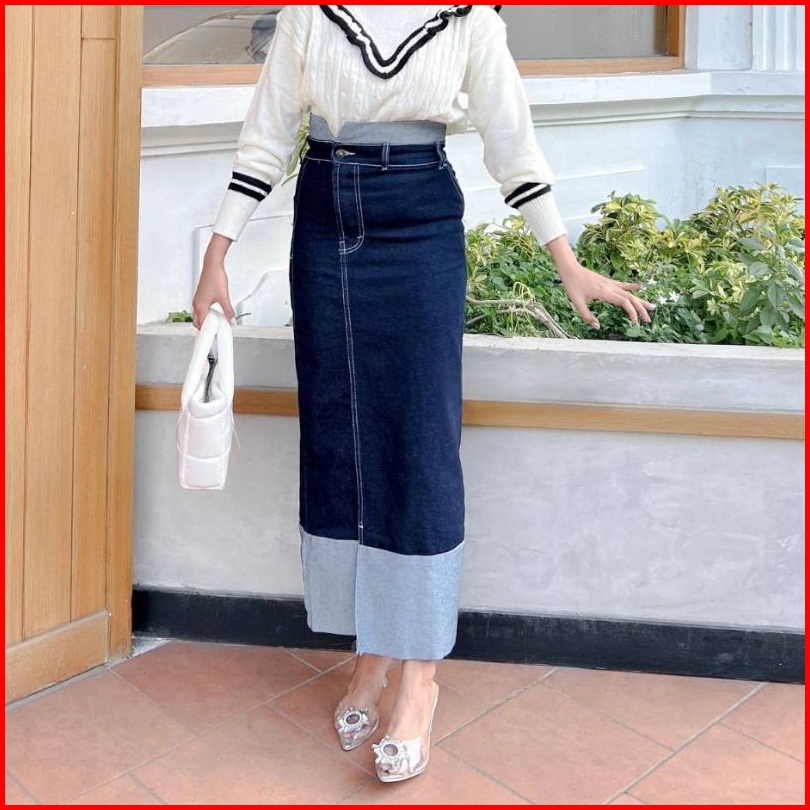 Rok Jeans Two Tone Highwaist Skirt Wanita Streach
