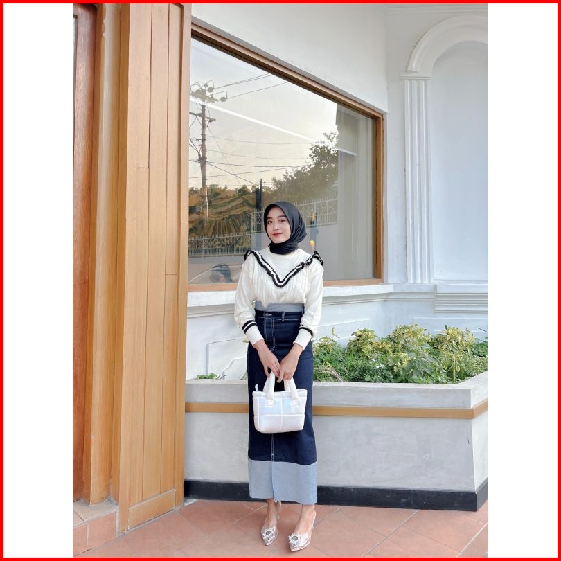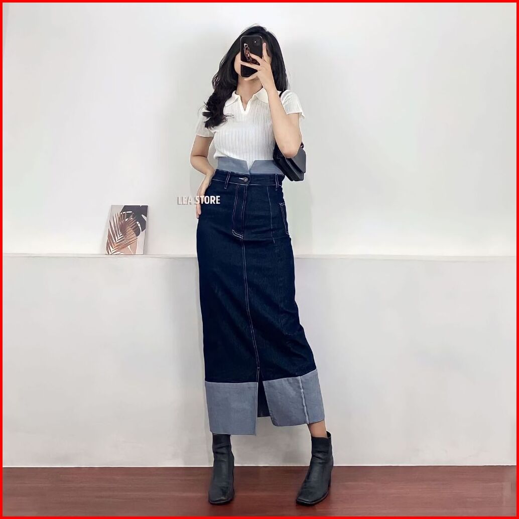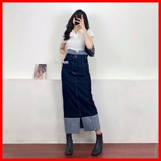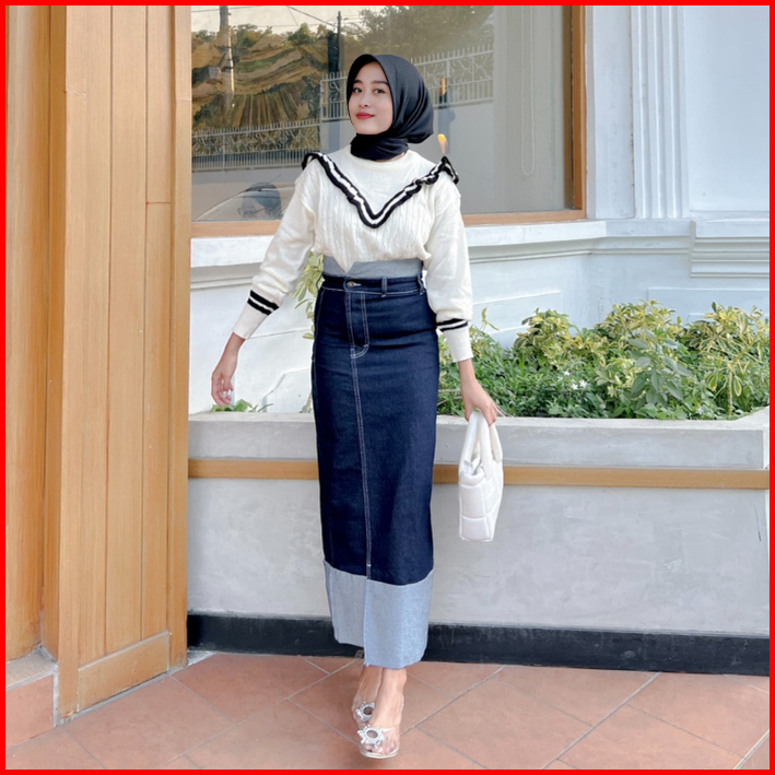 Two Tone Rok Skrit Jeans Highwaist Wanita Streach