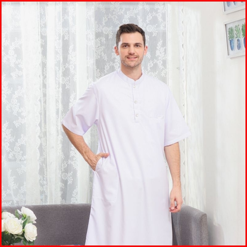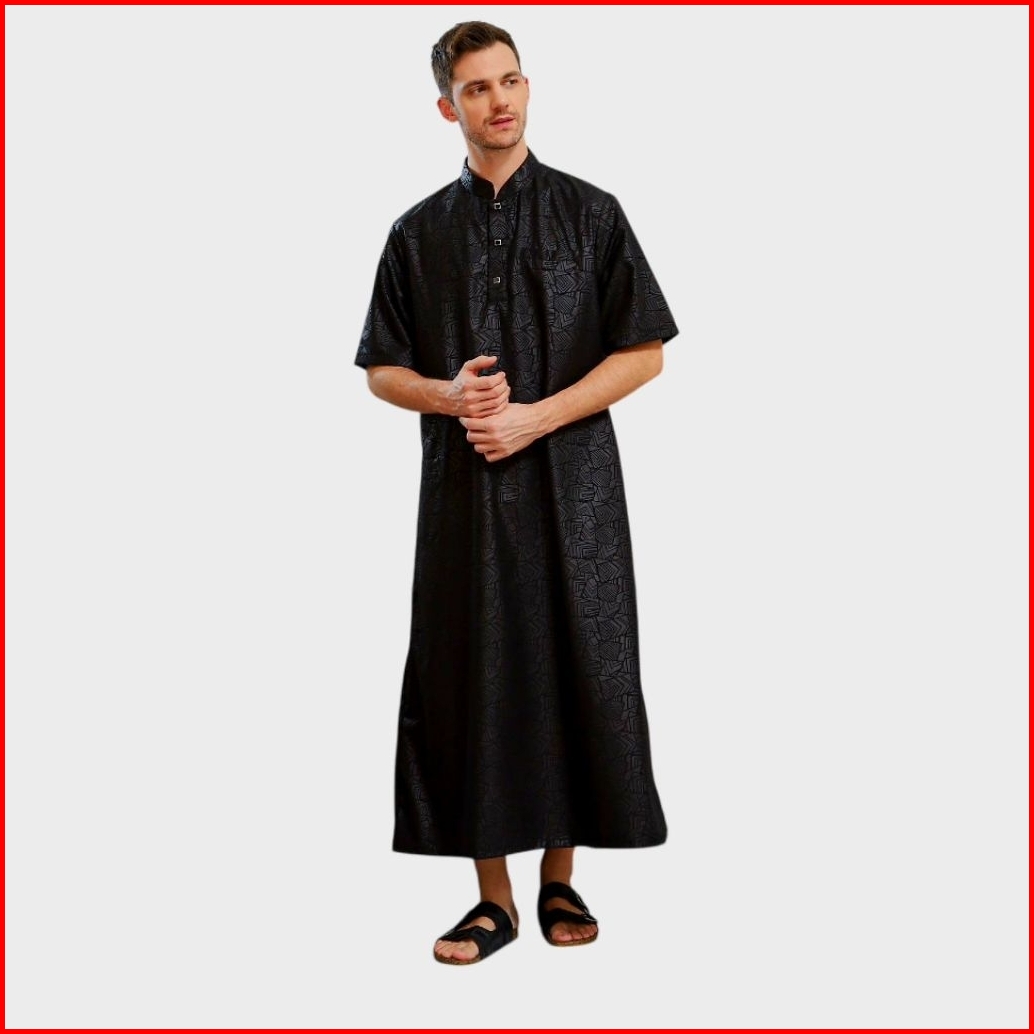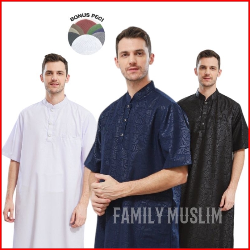 Family Muslim - Jubah Pria Dewasa Lengan Pendek Slimfit Motif Emboss Al-kof Hitam