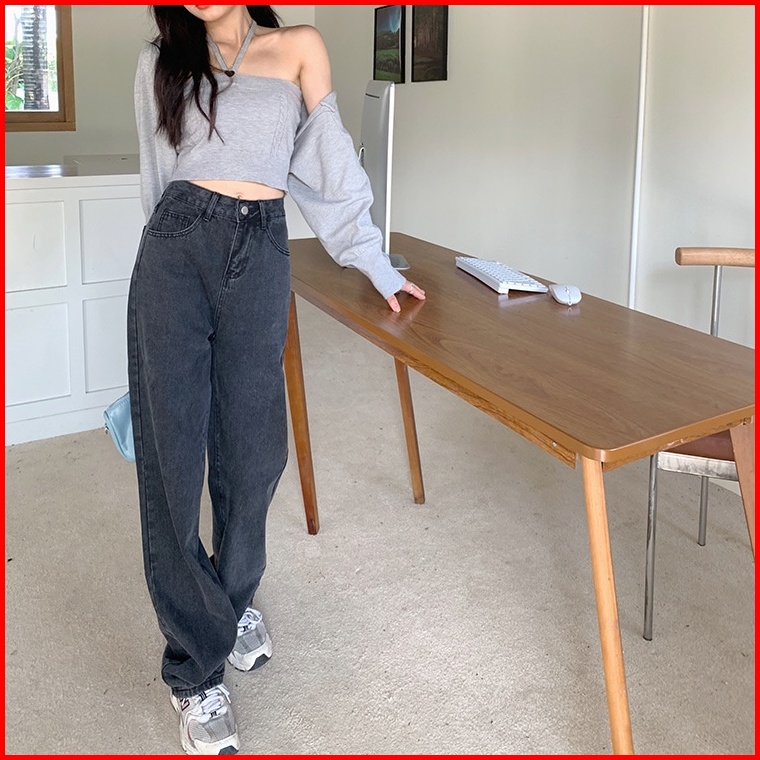 Jeans Lurus Hitam Ramping Pinggang Tinggi Untuk Wanita