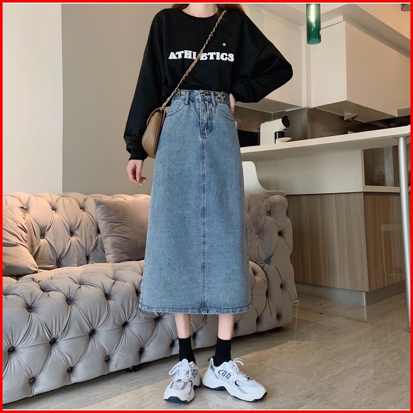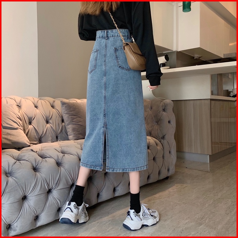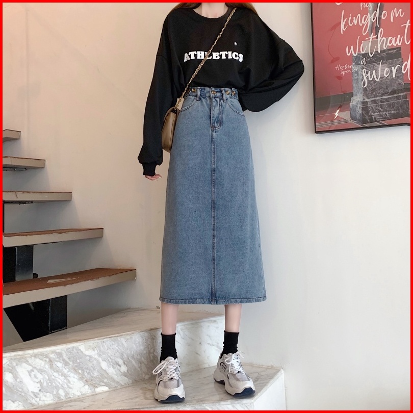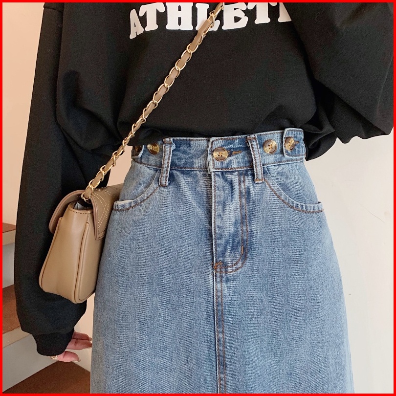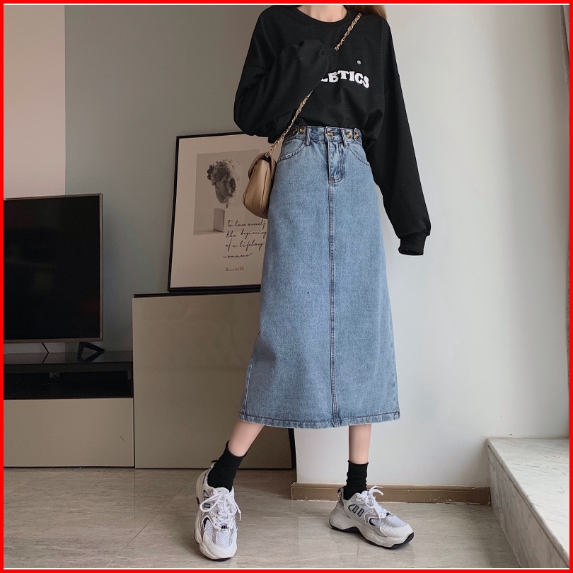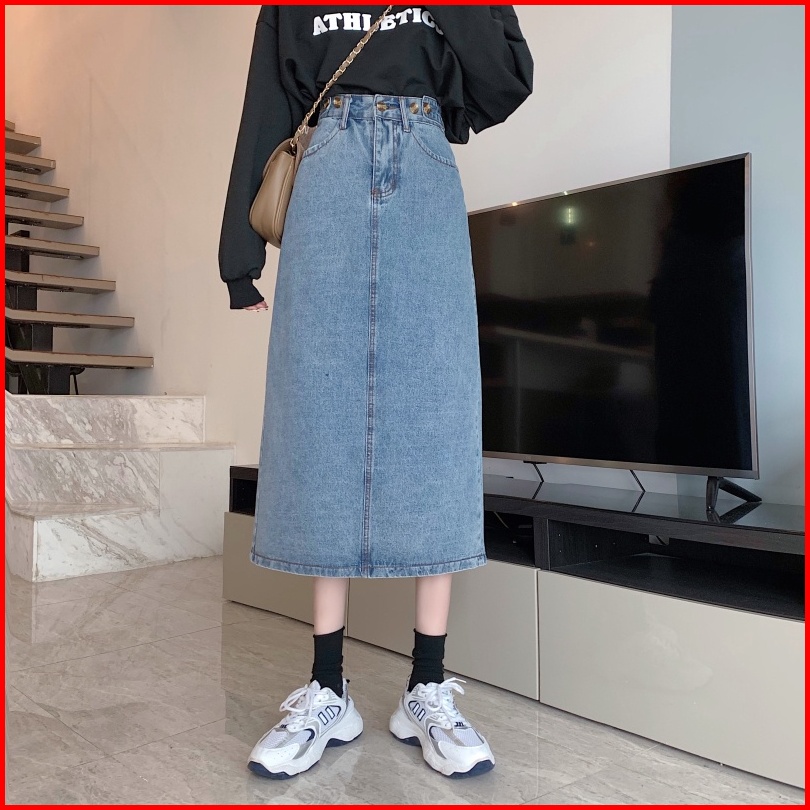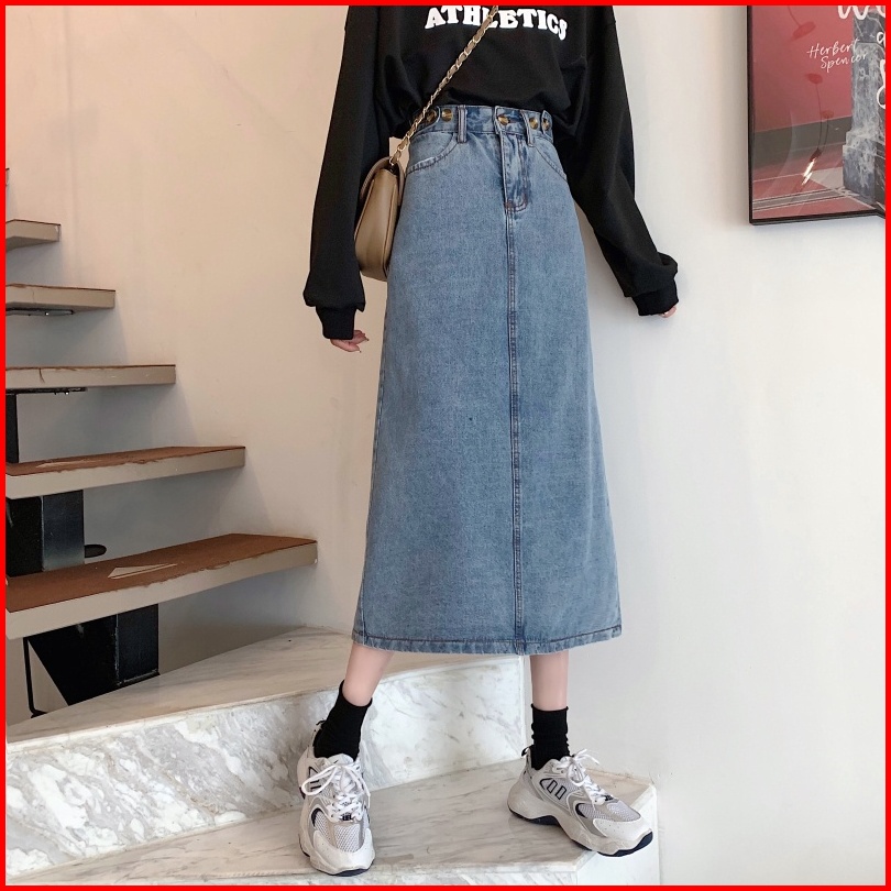 Rok Jeans Panjang Wanita Kancing Depan Belah Front Slit