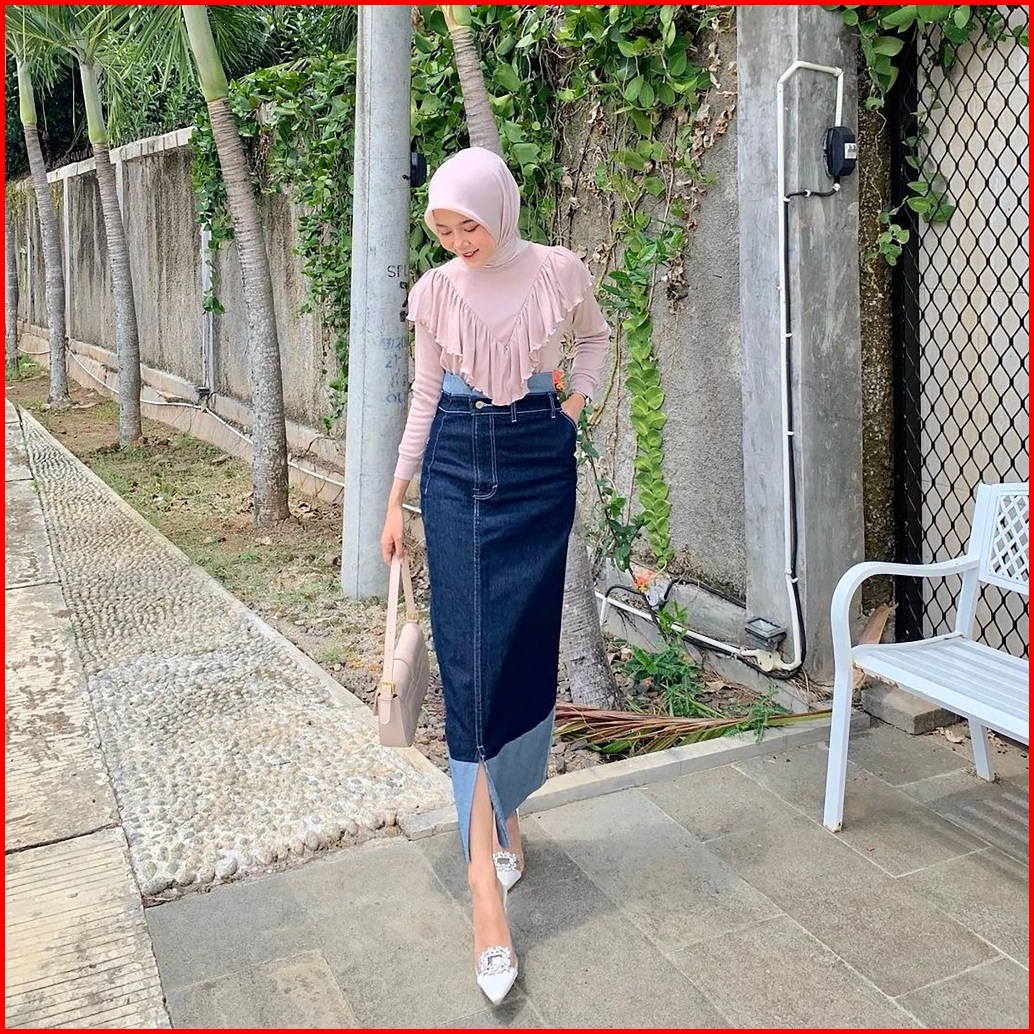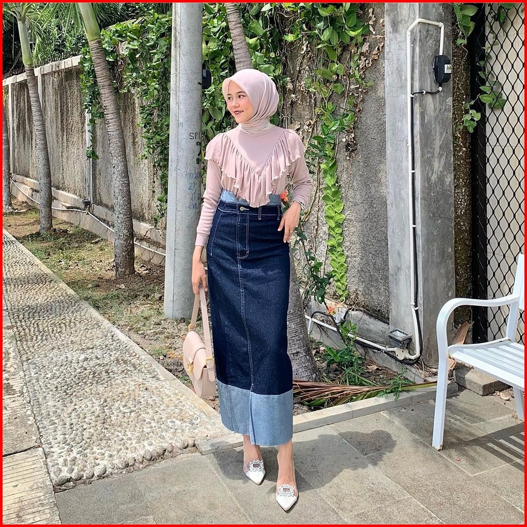 Two Tone Rok Skirt Jeans Hightwaist Wanita Streach Panjang Casual