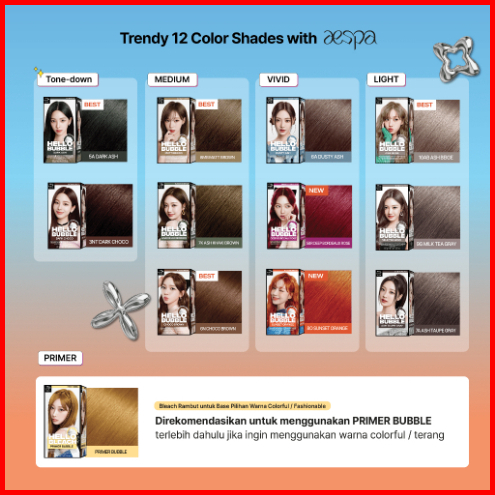 6N ChocoBrown Aespa, Ash Taupe Grey Aespa, Dark Ash Aespa, Milk Tea Aespa, Sunset Orange Aespa, Deep Bordeaux Aespa, Ash Beige Aespa, Matt Brown Aespa, DarkCoco Aespa, Dusty Aespa, Khaki Aespa, Primer Aespa, Ash Rose BP, Peri Violet BP